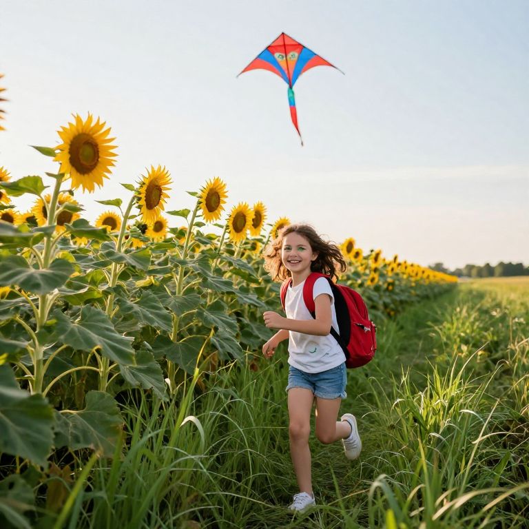 A lush green field setting during late summer afternoon, with tall sunflowers swaying in the breeze and a red and blue kite flying high in the sky. A young girl with curly brown hair and bright green eyes runs through the grass, laughing, her red backpack slightly torn at the corner.