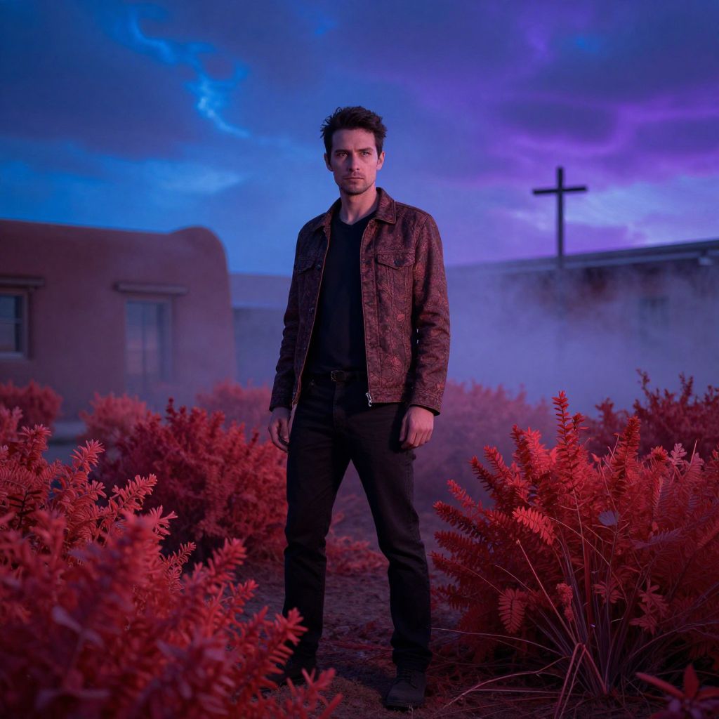 Philosophical cactus in a tan trench coat stands confidently in a desert landscape, gesturing toward a towering green saguaro cactus while the setting sun casts a warm glow over rocky hills and sparse shrubs.