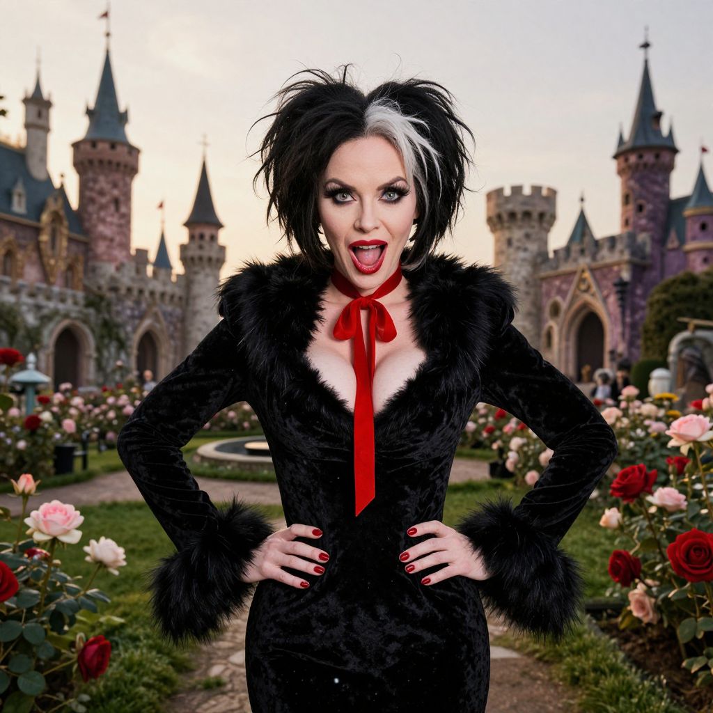 Photograph of Cruella de Vil in her classic costume—black velvet dress with a fur trim, long sleeves, and a red ribbon around the collar—standing confidently in a gothic-style park, surrounded by ornate castles and flowering roses under golden hour light. The woman has a sharp, mischievous look, with high cheekbones, a wide mouth slightly ajar, and a smirk. Her eyes are wide and sharp, conveying both elegance and malice.. The woman has big breasts and cute face