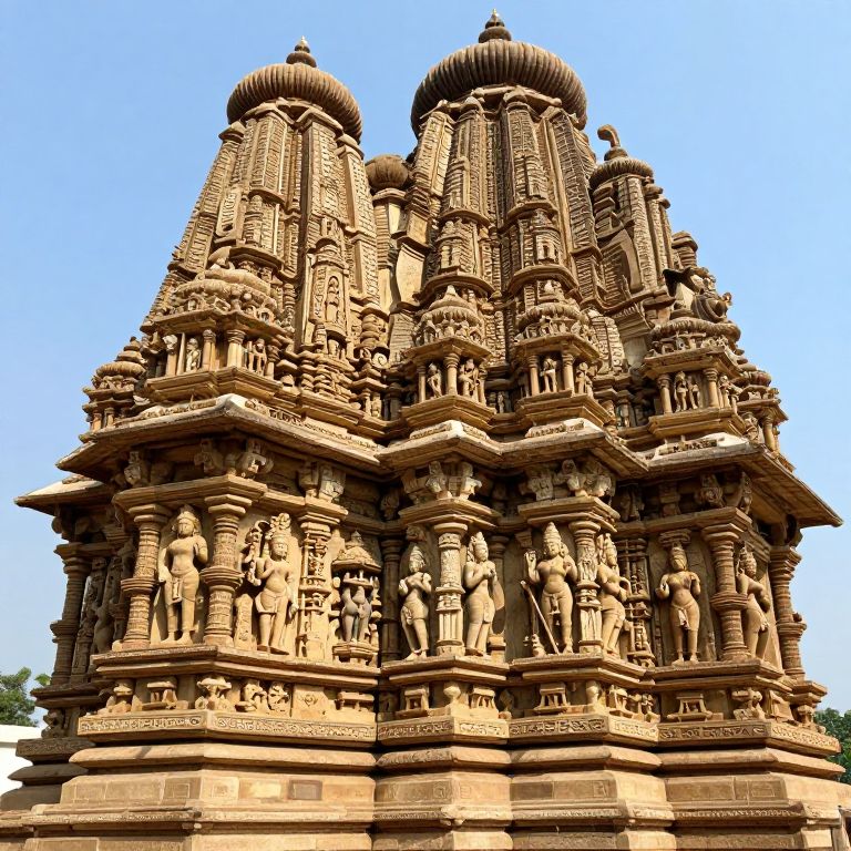 Photograph of a detailed, multi-tiered Hindu temple with intricate carvings, brown sandstone, and two large domed towers against a clear