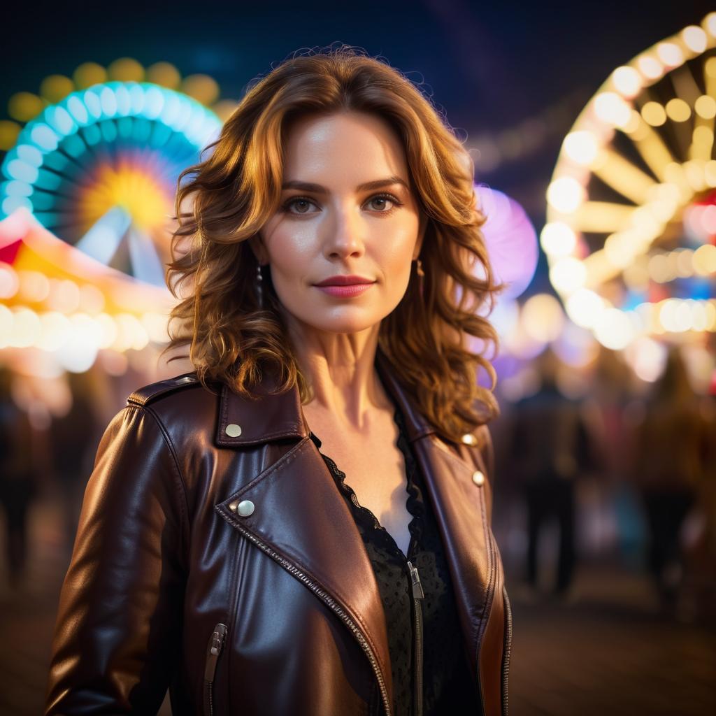 Portrait of a woman in her forties with wavy chestnut hair, wearing a chic black leather jacket and a delicate necklace. The photo is taken at night in a vibrant carnival setting, featuring colorful bokeh lights and a ferris wheel in the background, creating a lively and atmospheric scene.