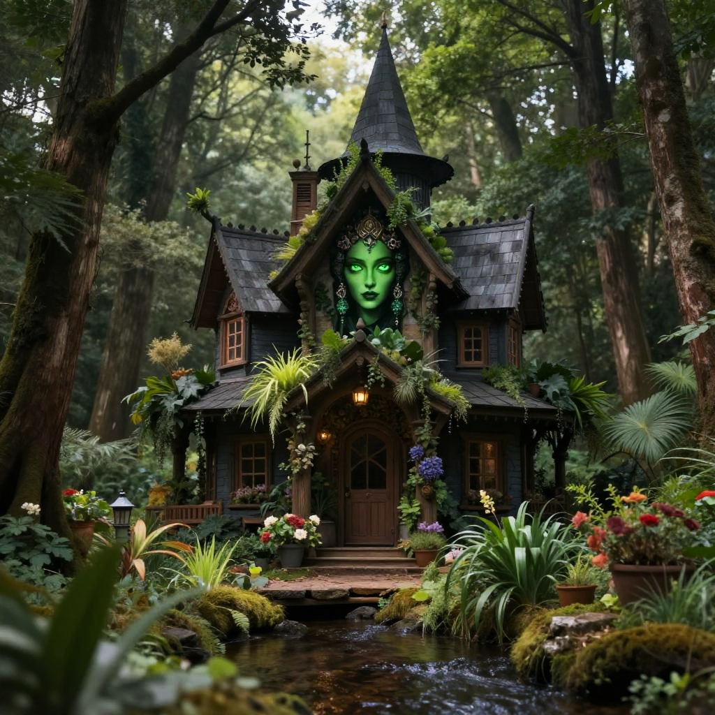 Hyperrealistic photo of a witch's house surrounded by lush greenery in a dense forest. The house features wooden architecture with plants and flowers decorating the eaves and doorway. A striking green-faced witch with glowing eyes and elaborate jewelry appears at the upper window, tending to the surrounding garden. The scene includes a clear stream flowing in front of the house, enhanced with soft cinematic light and a dramatic, atmospheric perspective.