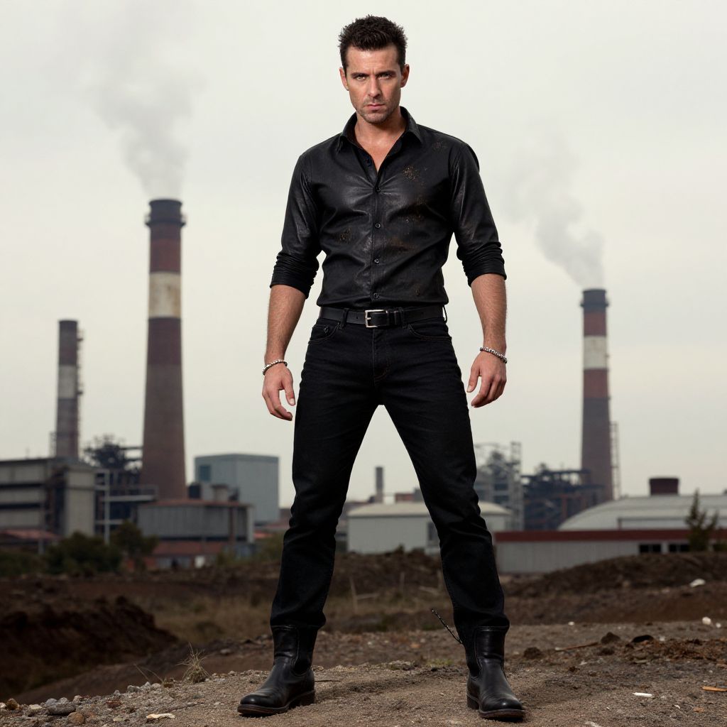 Photograph of a muscular, attractive man with short, dark hair and light skin, standing confidently in an industrial landscape. He wears a black, long-sleeved, button-up shirt with the sleeves rolled up, black jeans, and black boots. A silver bracelet adorns his left wrist. The background features two tall smokestacks and industrial buildings under a cloudy sky, with a rocky, barren ground in the foreground. The man's intense gaze and slightly parted lips add a sense of determination. The image has a high-contrast, slightly dramatic style.