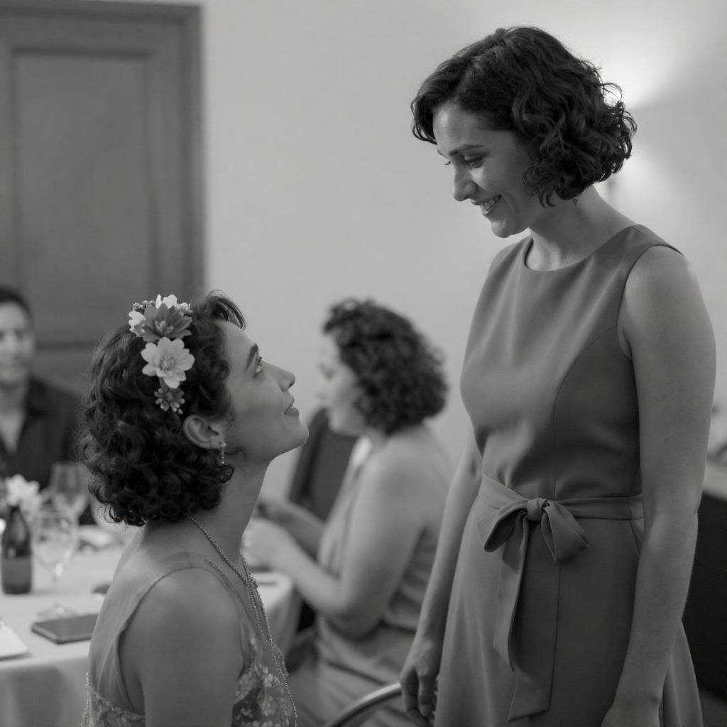 Black-and-white photograph of two women inside a room. The woman on the left has short curly hair adorned with a flower headpiece and is seated, looking up at the standing woman on the right. The standing woman has short wavy hair and wears a sleeveless dress with a bow tied at the waist. In the background, other people and a table with glassware are softly blurred.