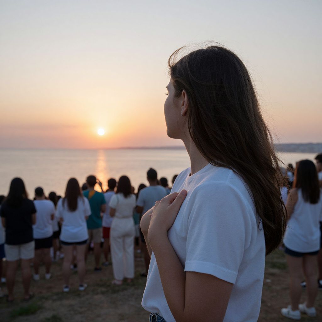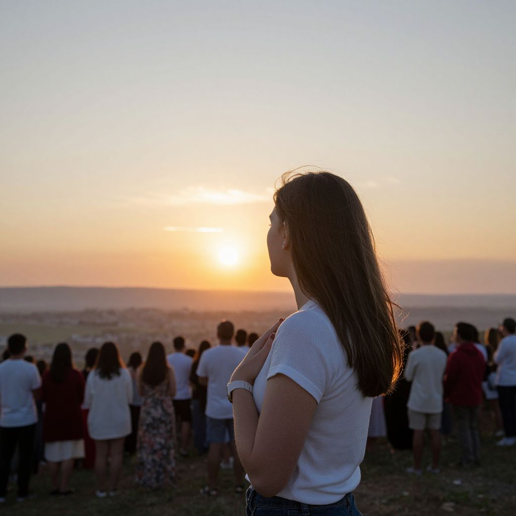 A photograph captures a silhouette of a young woman with long brown hair, standing in profile, gazing at a sunset. She wears a white short-sleeved shirt and a wristwatch, with her hands clasped near her chest. The sun, low on the horizon, casts a warm orange and pink glow across the sky and landscape. In the background, a large group of people, mostly dressed in white shirts, stands on a grassy field, facing the sunset. The scene is serene, with the sun's light creating a soft glow on the woman's face and the distant horizon.