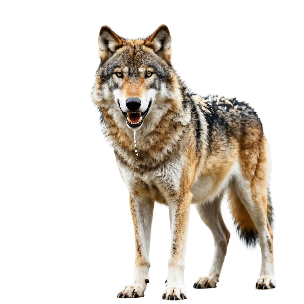 No humans, open mouth, saliva, whiskers, realistic, animal focus, fangs, claws, teeth, solo, animal, wolf, looking at viewer, tongue, drooling, full body, sharp teeth