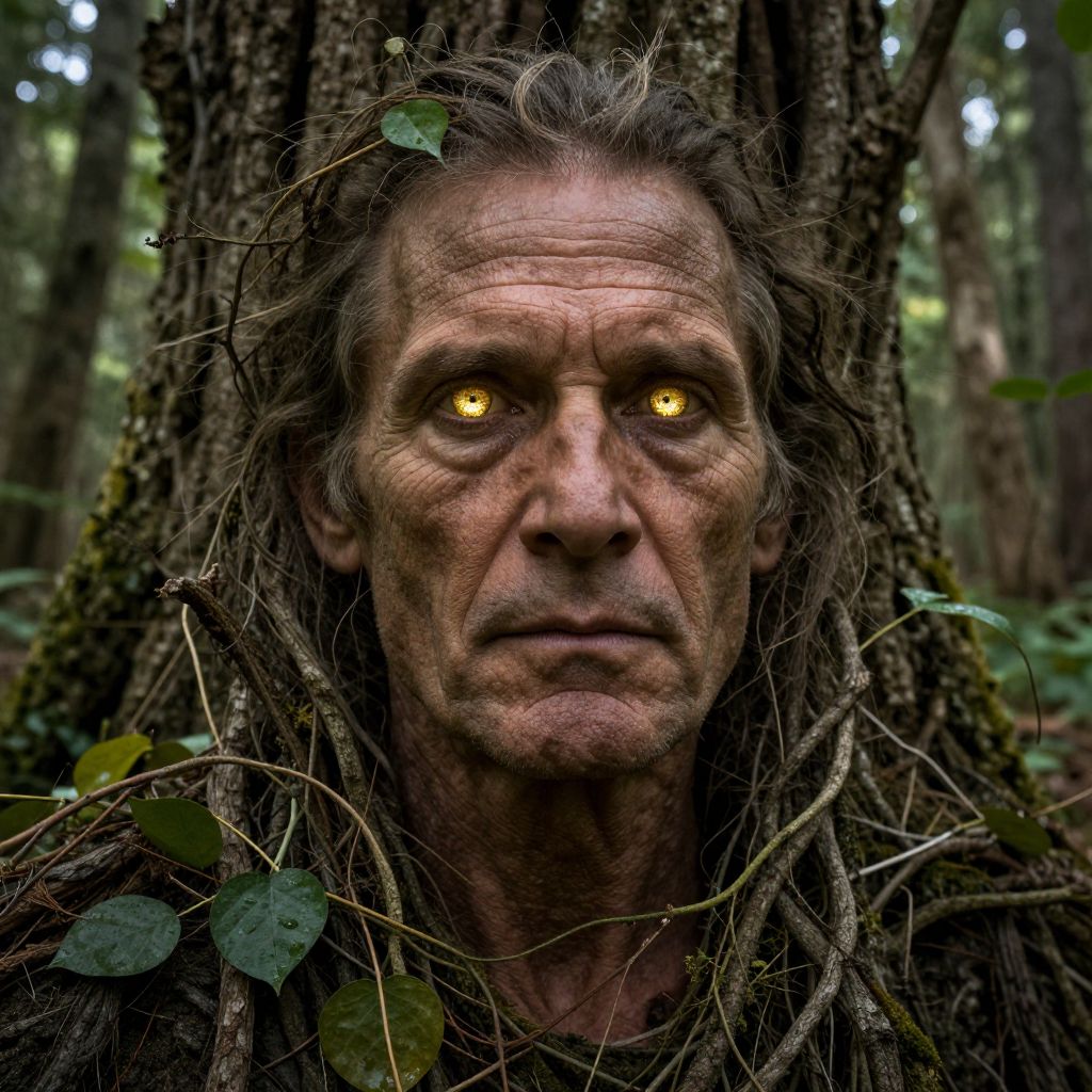 Photograph of a gaunt, weathered man with glowing yellow eyes, long wild hair, and tree branches intertwining with his face, standing in