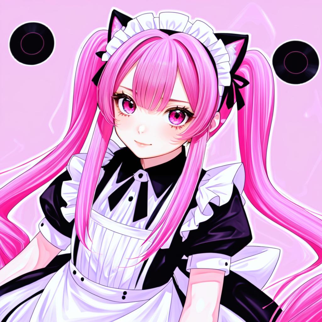 Digital anime-style illustration of a young girl with long pink twintails and pink eyes, dressed in a classic black and white maid outfit with a maid headdress and cat ears. The character features twin drills hairstyle and a soft pink background with minimalistic circular elements.