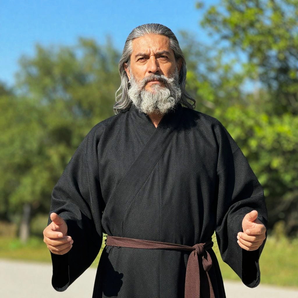 Middle-aged man with gray beard and long gray hair, wearing a black robe with a brown sash, standing outdoors. Bright blue sky and lush green trees in the background. Man looking forward, hands slightly raised. Photorealistic image.