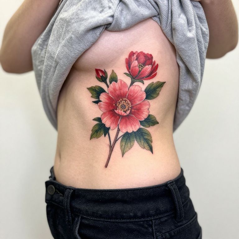 Photograph of a person's side torso showing a colorful, realistic tattoo of red and pink flowers with green leaves on their lower ribcage. The person is wearing a gray, slightly lifted shirt and black jeans. The tattoo is detailed with shading and texture, capturing the delicate petals and stems. The background is blurred and white.