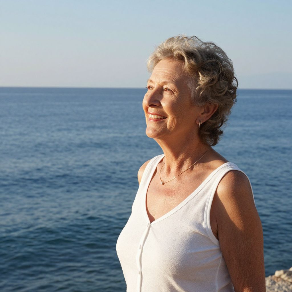 Photograph of an older woman with short, grayish-blonde hair, standing outdoors by a large body of water under a clear blue sky. She wears a simple white tank top, revealing her tanned, wrinkled skin. She has a warm smile and light brown eyes, looking slightly to the right. The sunlight casts soft shadows, highlighting her facial features. The calm, blue ocean stretches out behind her, with the horizon line visible in the background. She stands on a rocky shoreline, with small rocks partially visible in the lower left corner. The overall mood is serene and peaceful.