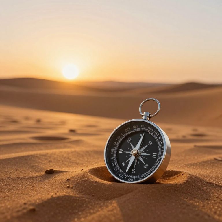 In the golden embrace of a desert sunset, a compass stands still amidst shifting sands, its needle pointing toward an elusive truth, symbolizing the eternal quest for direction in a world of endless mirages and unspoken whispers.
