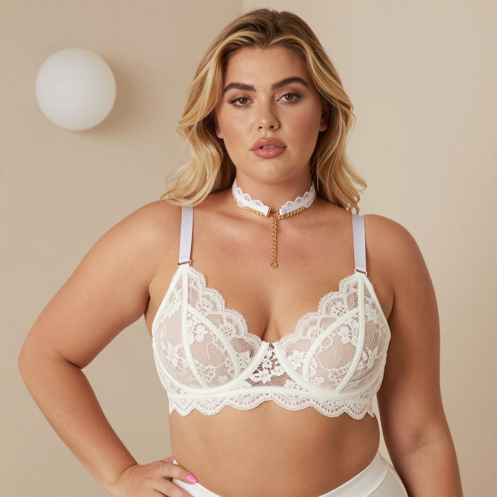 Photograph of a curvy woman with light skin, long blonde hair, and dark eyebrows. She wears a white lace bra with a central clasp and a white lace choker with a gold chain. Her right hand with pink nails rests on her hip. She has a neutral expression. Background includes a beige wall and a round, white wall sconce. She is centered in the frame.