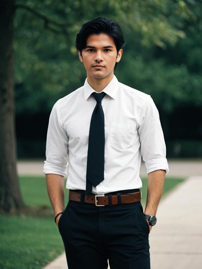 Looks costume, 1boy, male focus, solo, necktie, shirt, white shirt, blurry background, pants, black hair, black pants, watch, wristwatch, blurry, belt, collared shirt, outdoors, black necktie, looking at viewer, hands in pockets, standing, closed mouth
