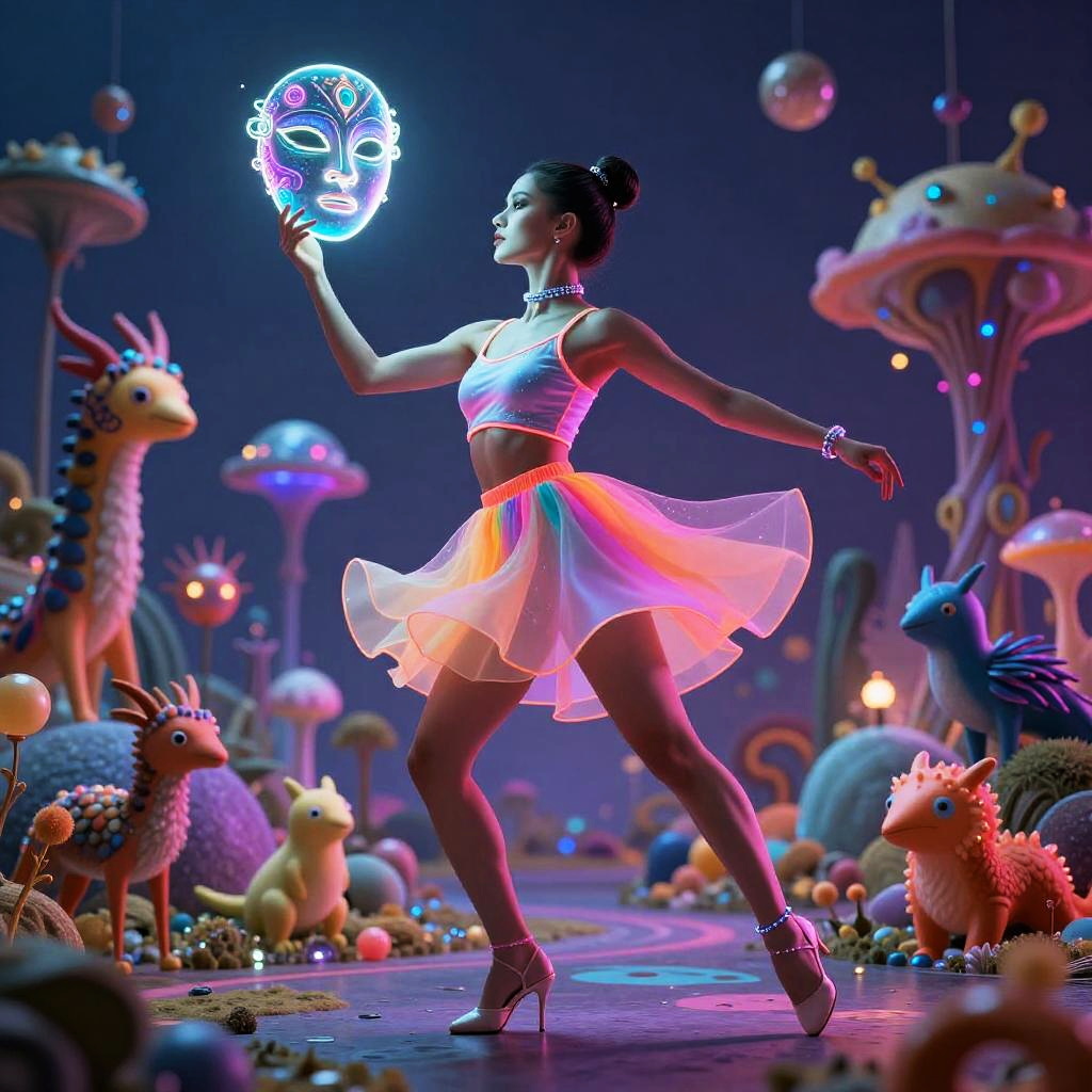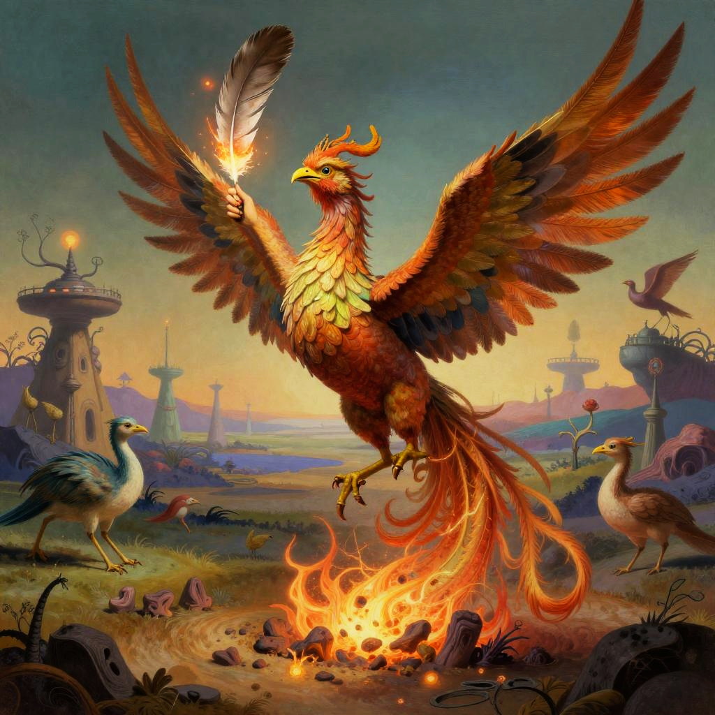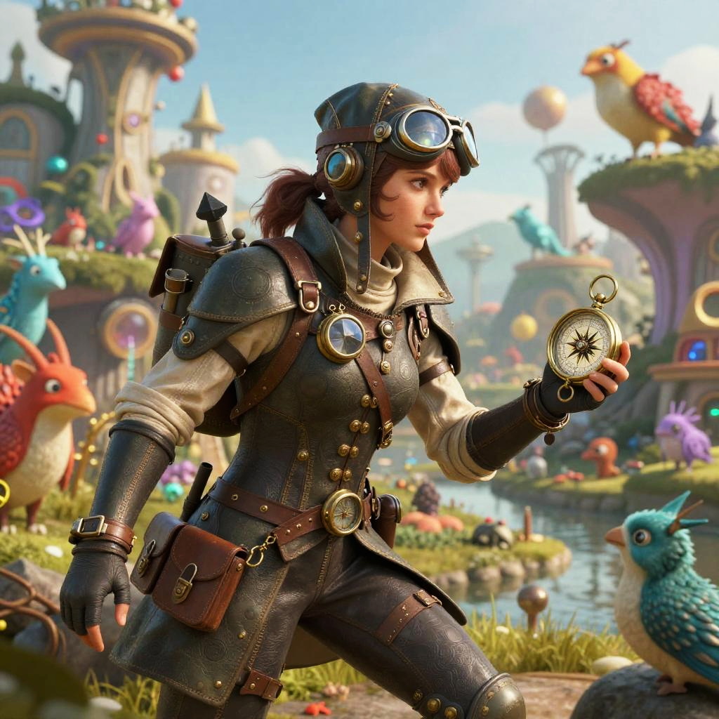 Illustrate an intrepid space explorer inspired by the styles of Moebius, navigating a surreal landscape filled with fantastical elements. In his hand, he holds a holographic map, surrounded by vibrant creatures and dreamlike scenery.