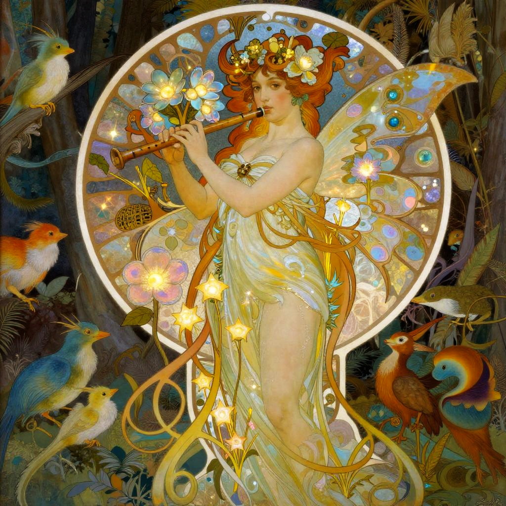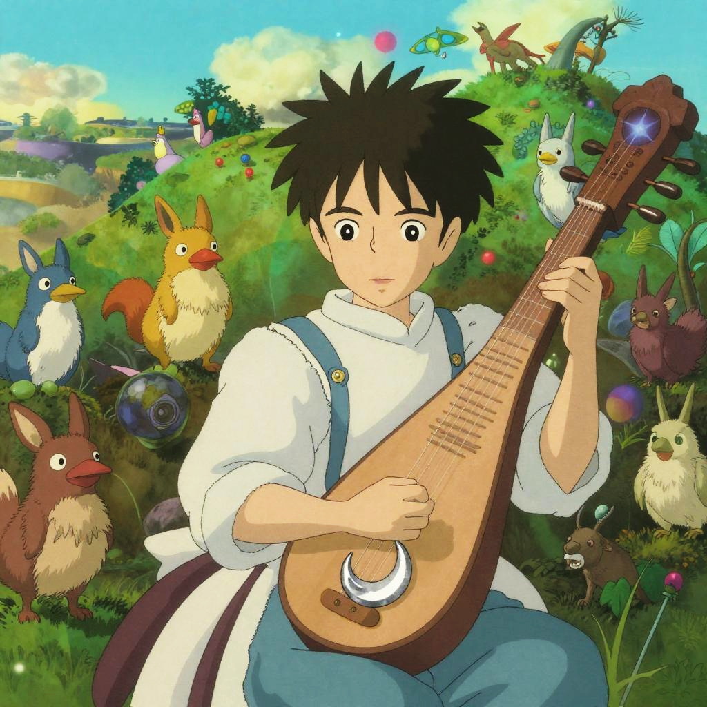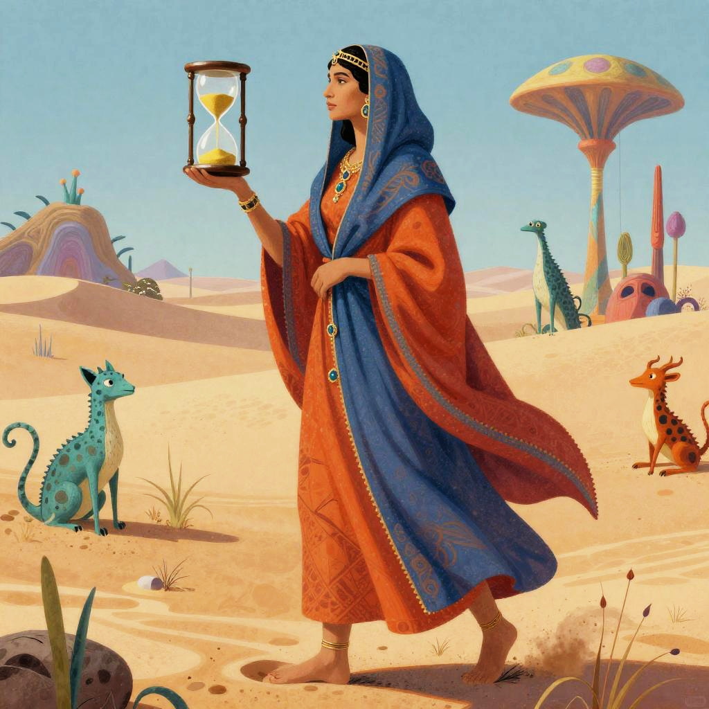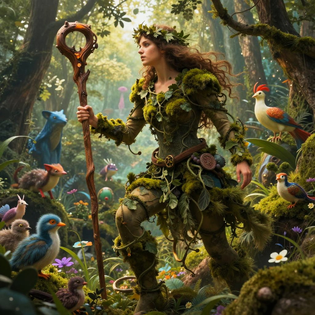 Illustrate an intrepid space explorer inspired by the styles of Moebius, navigating a surreal landscape filled with fantastical elements. In his hand, he holds a holographic map, surrounded by vibrant creatures and dreamlike scenery.