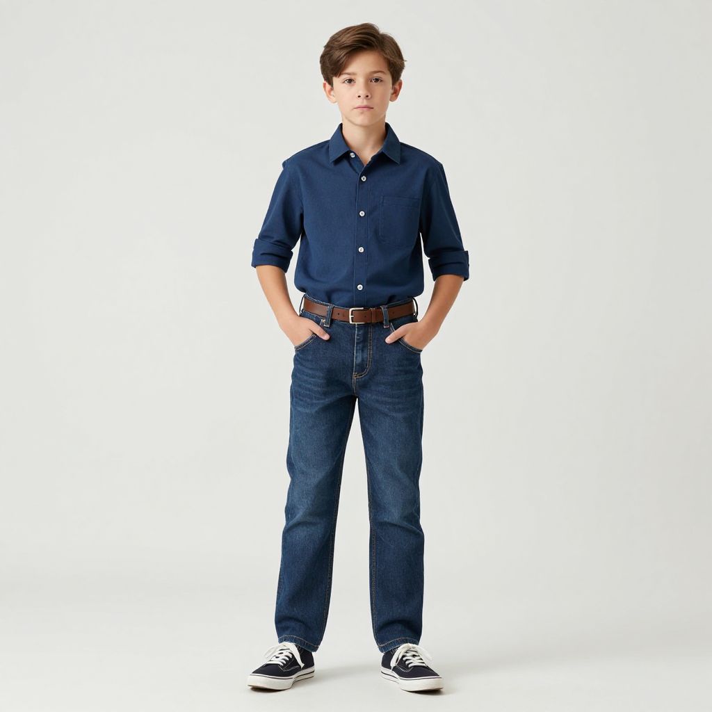 Photograph of a young boy with short brown hair, wearing a navy button-up shirt, dark blue jeans, brown belt, and black sneakers, standing