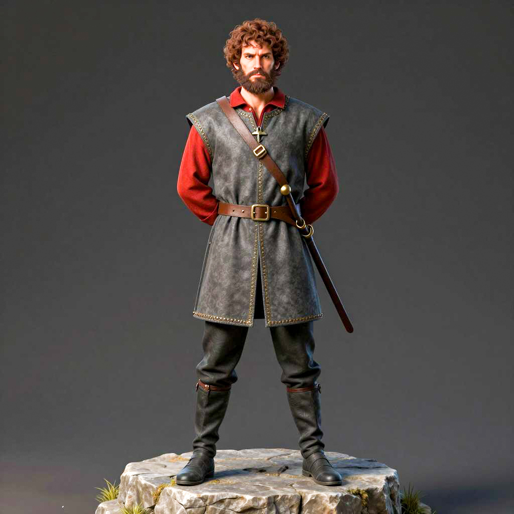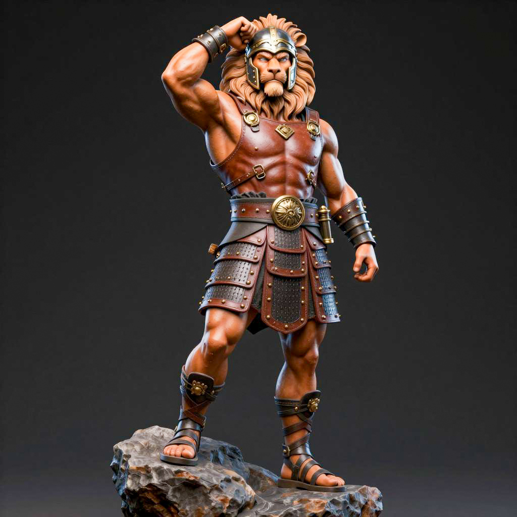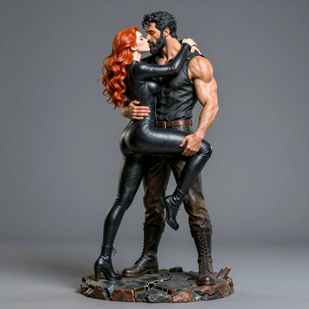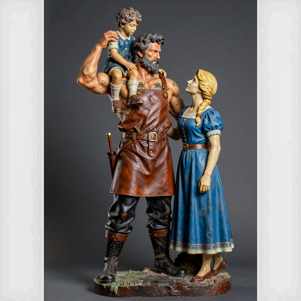 Statue of a muscular, bearded man with dark hair, tattooed chest, and wearing black pants, boots, and a brown leather apron, holding a small boy on his shoulders. A blonde woman with braided hair and a blue dress stands beside them, looking up at the man. The boy looks down at the woman. Dark background. The man has a serious expression. The boy and woman have neutral expressions. The statue is on a circular base.