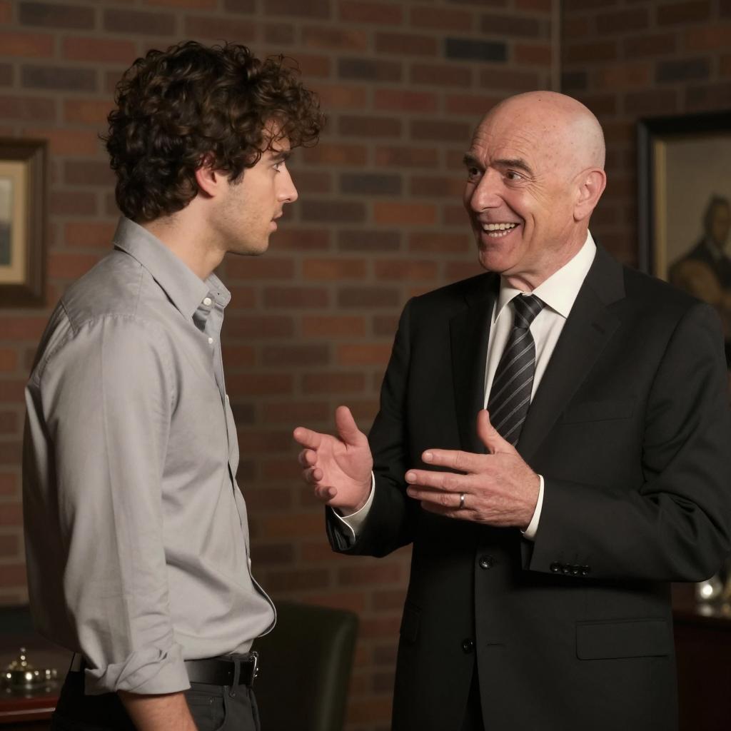 Photograph of a young man with medium-length dark brown hair in a blue suit and patterned tie, gesturing with his hands, looking down intently. Background includes a woman with long dark hair, blurred, and a flower vase on the left. Warm indoor lighting, wooden walls, and a white lamp.