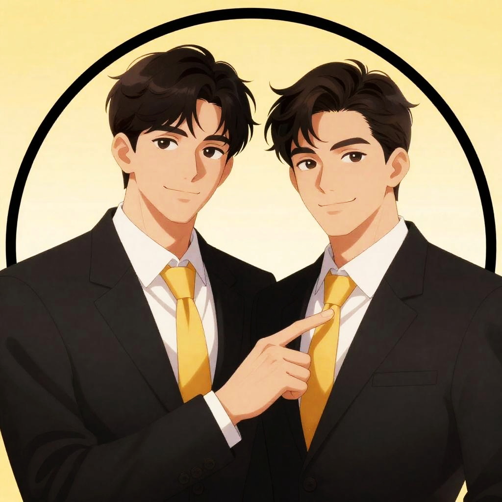 Illustration of two men with dark, wavy hair, dressed in black suits with white collars. The man on the left ties a yellow tie while smiling slightly, the man on the right points at the tie with a confident grin. Background is a yellow gradient with a black circular frame. Both men have light skin and strong jawlines.