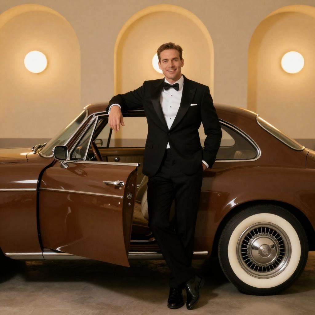 Photograph of a man in a black tuxedo standing beside a brown classic car with white-walled tires, open driver's door. He leans on the car, smiling. Background has yellow-lit, arched wall and circular lights.