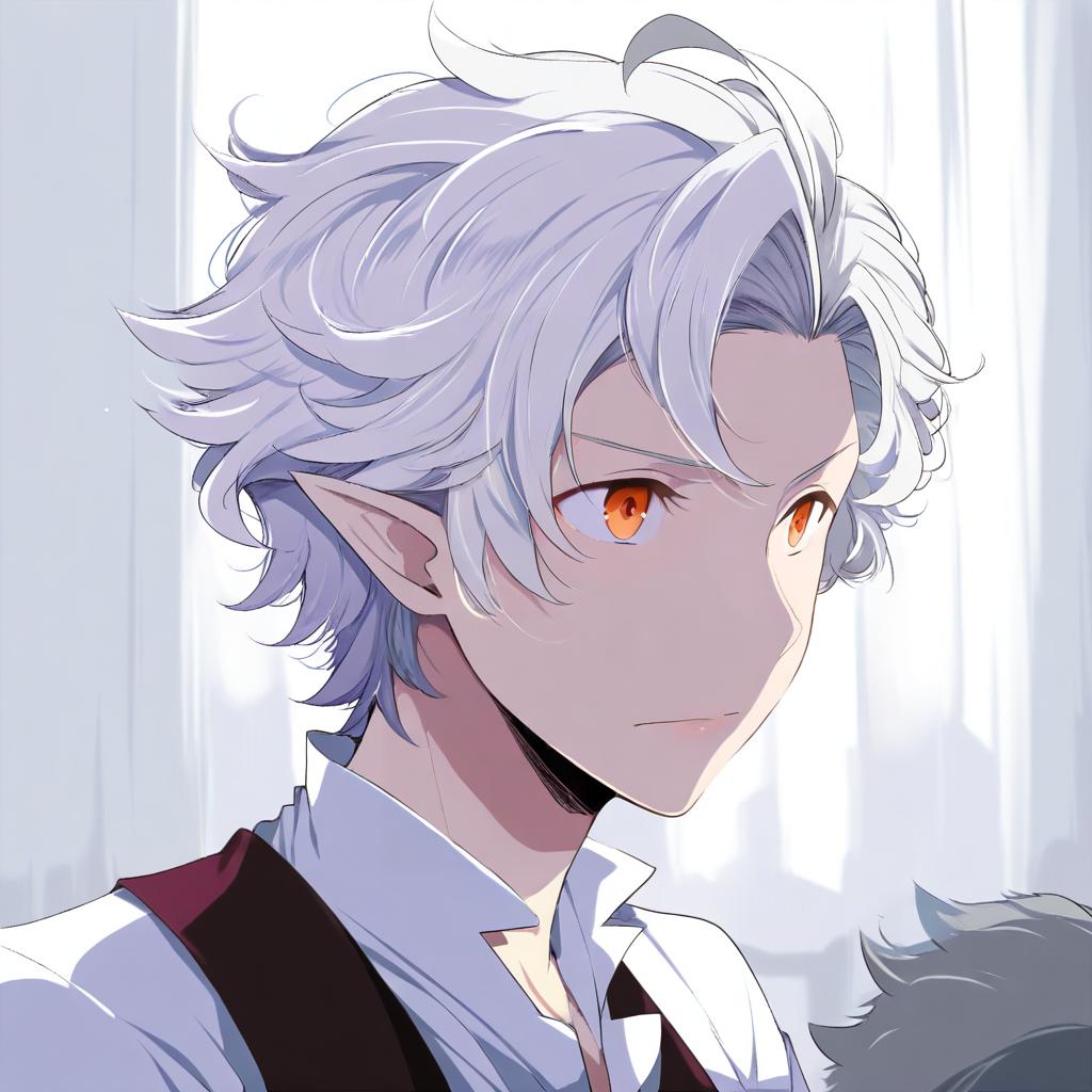 Astarion, baldur's gate, 1boy, red eyes, short hair, white hair, grey hair, white shirt, vampire, elf, by artist chata maru (irori sabou), animagine