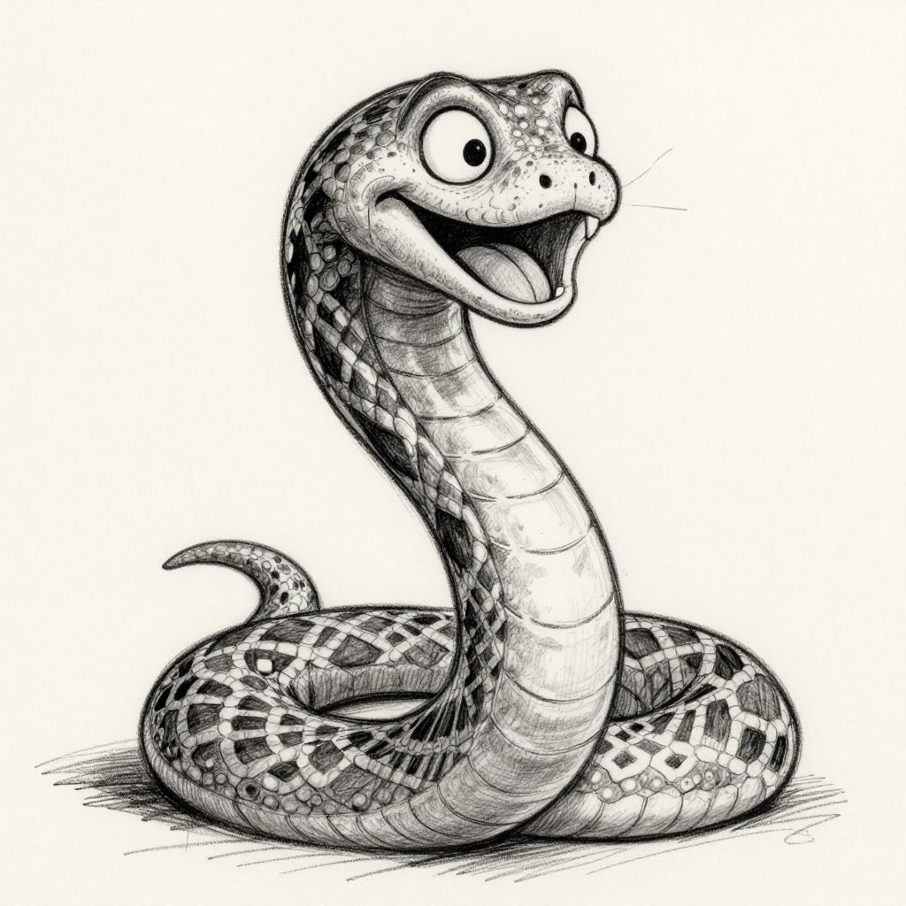 Black-and-white cartoon drawing of a cheerful, wide-eyed snake with patterned scales, smiling with its mouth open, coiled on a white background.
