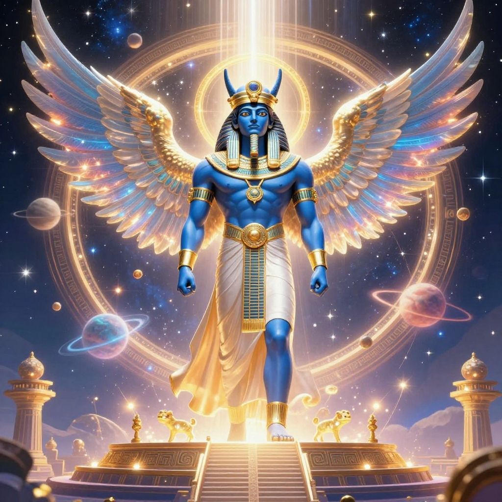 Digital illustration of Isis, the ancient Egyptian goddess of magic, motherhood, and healing. She is depicted as a tall figure with vibrant blue feathers, a celestial crown, and extended white wings. She stands between two white falcons amidst colorful flowers and greenery, with a glowing golden halo and full moons in the starry night sky behind her. The setting evokes an ethereal, mystical garden ambiance.