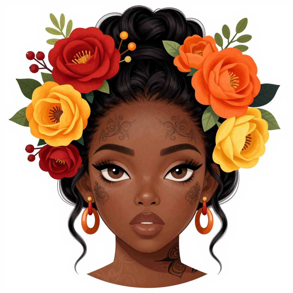 The image depicts a highly detailed and vibrant illustration of a fashionable black woman with a symmetrical and captivating face. Her almond-shaped brown eyes are large and expressive, adorned with intricate tattoos that add a layer of depth and personality to her appearance. The woman's hair is styled in an elaborate updo, decorated with a variety of colorful flowers, including roses in shades of red, orange, and yellow, as well as green leaves and berries. The flowers are arranged in a symmetrical pattern, creating a visually pleasing and balanced composition.