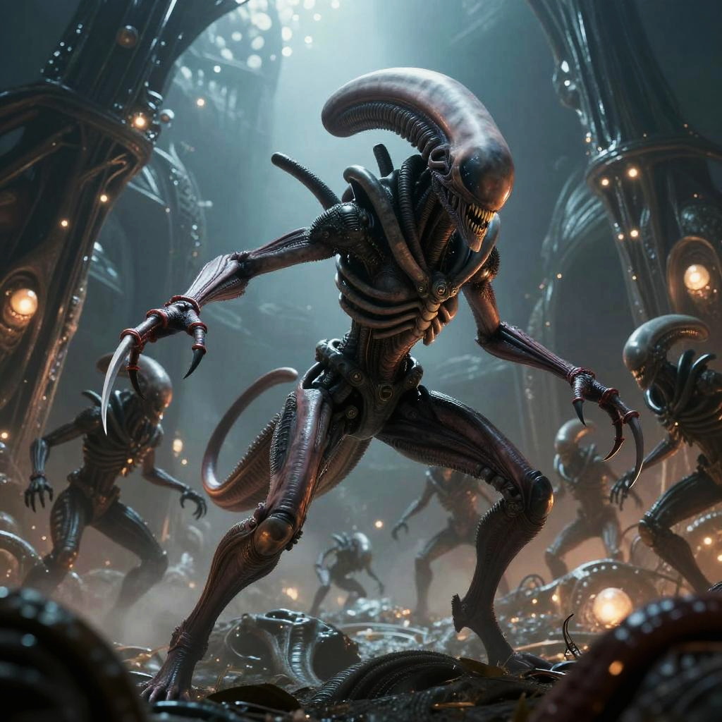 Queen mother xenomorph in alien nest chamber, towering over smaller xenomorph drones, wet shiny biomechanical skin, sharp claws dripping acid blood, dim blue and green lighting highlighting textures, intense sci-fi horror scene evoking dread and power.