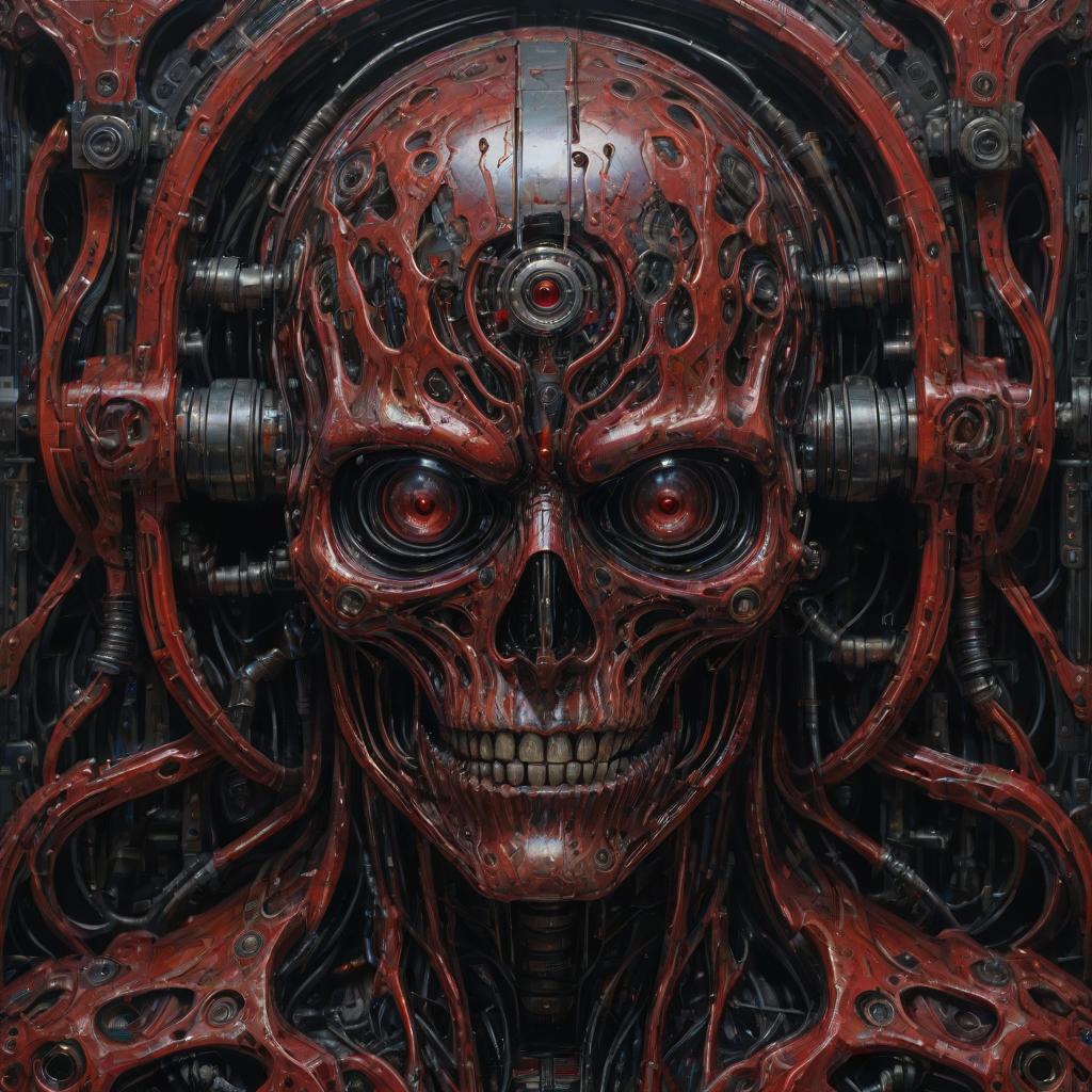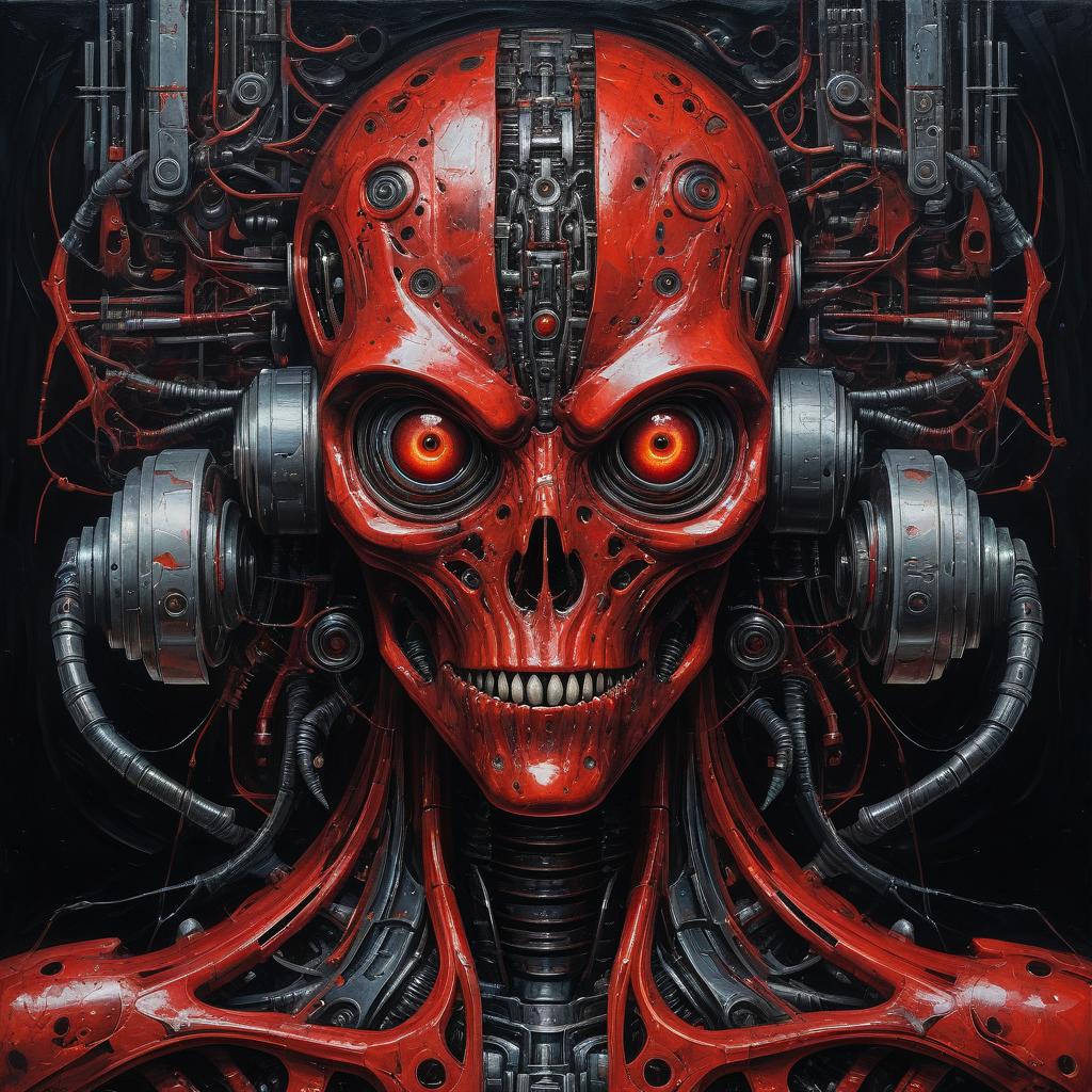 Ultra-detailed close-up front view of a biomechanical entity featuring a fusion of human and alien characteristics. The entity's face is rendered in vivid red with black mechanical components, displaying large mechanical eyes and intricate textures. The artwork evokes a nightmarish, horror theme inspired by Zdzisław Beksiński, emphasizing the horror of technology with highly realistic oil painting textures.