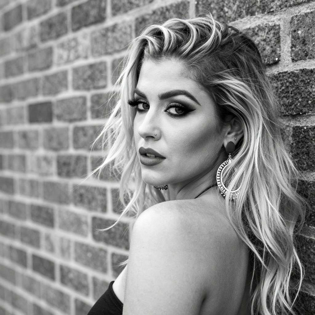Black and white photo of a woman with long wavy blonde hair, heavy eyeliner, full lips, and a nose piercing. She wears large, intricate earrings and gazes slightly to the left with a neutral expression. She leans against a ured brick wall. She is turned slightly to the side, showing her bare shoulder. The background is blurred brick.