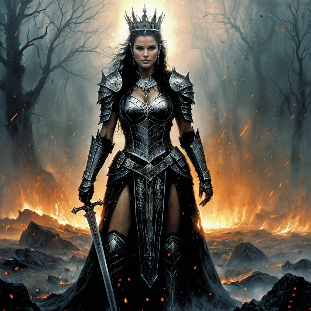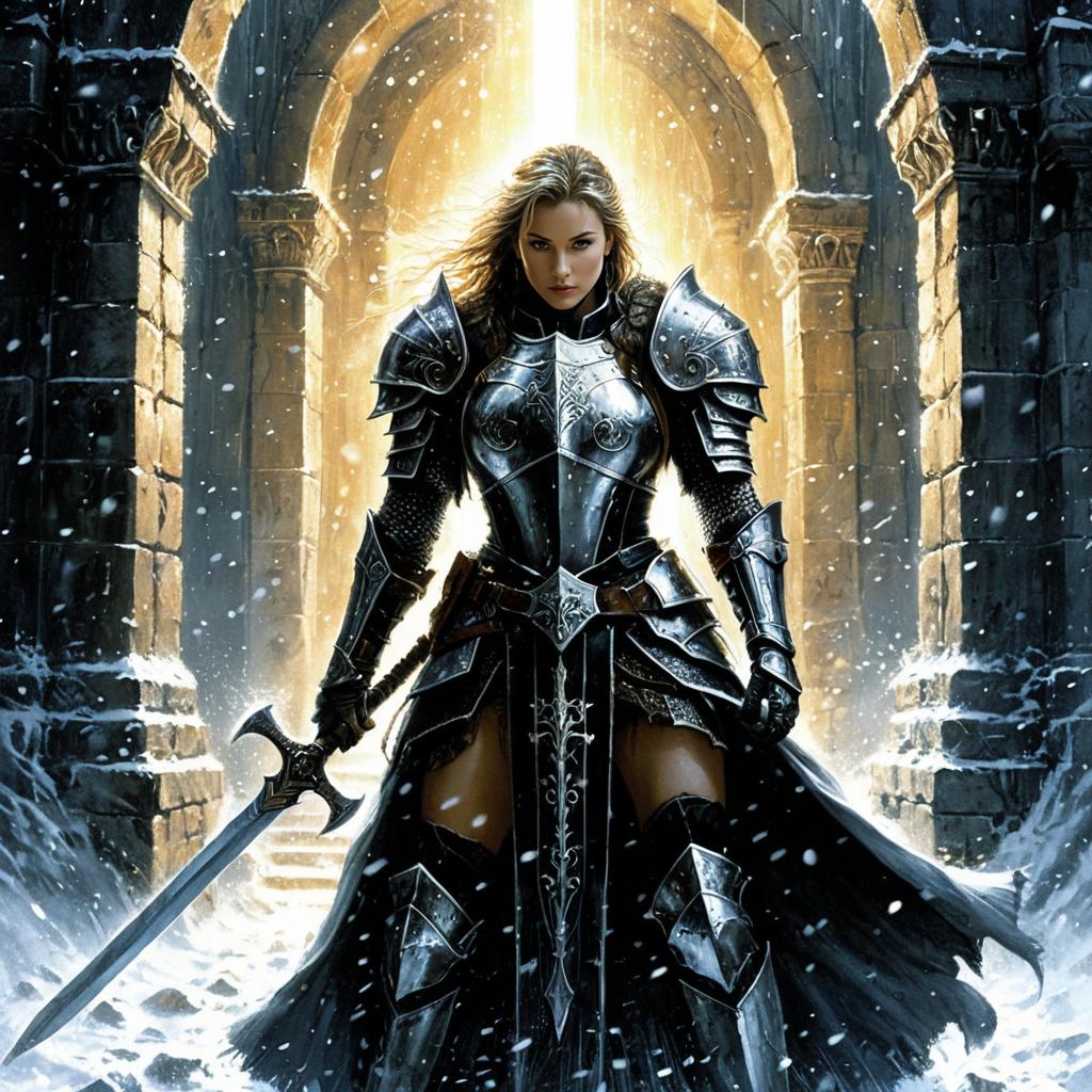 Illustration by Luis Royo depicting an armored paladin, her figure illuminated by the soft glow of a radiant hammer of light. She stands amidst a fortress under siege, as swirling snowflakes drift through the air. The scene is drenched in shadow and light, capturing a moment of triumph and sorrow, with a sense of looming danger and epic resolve.