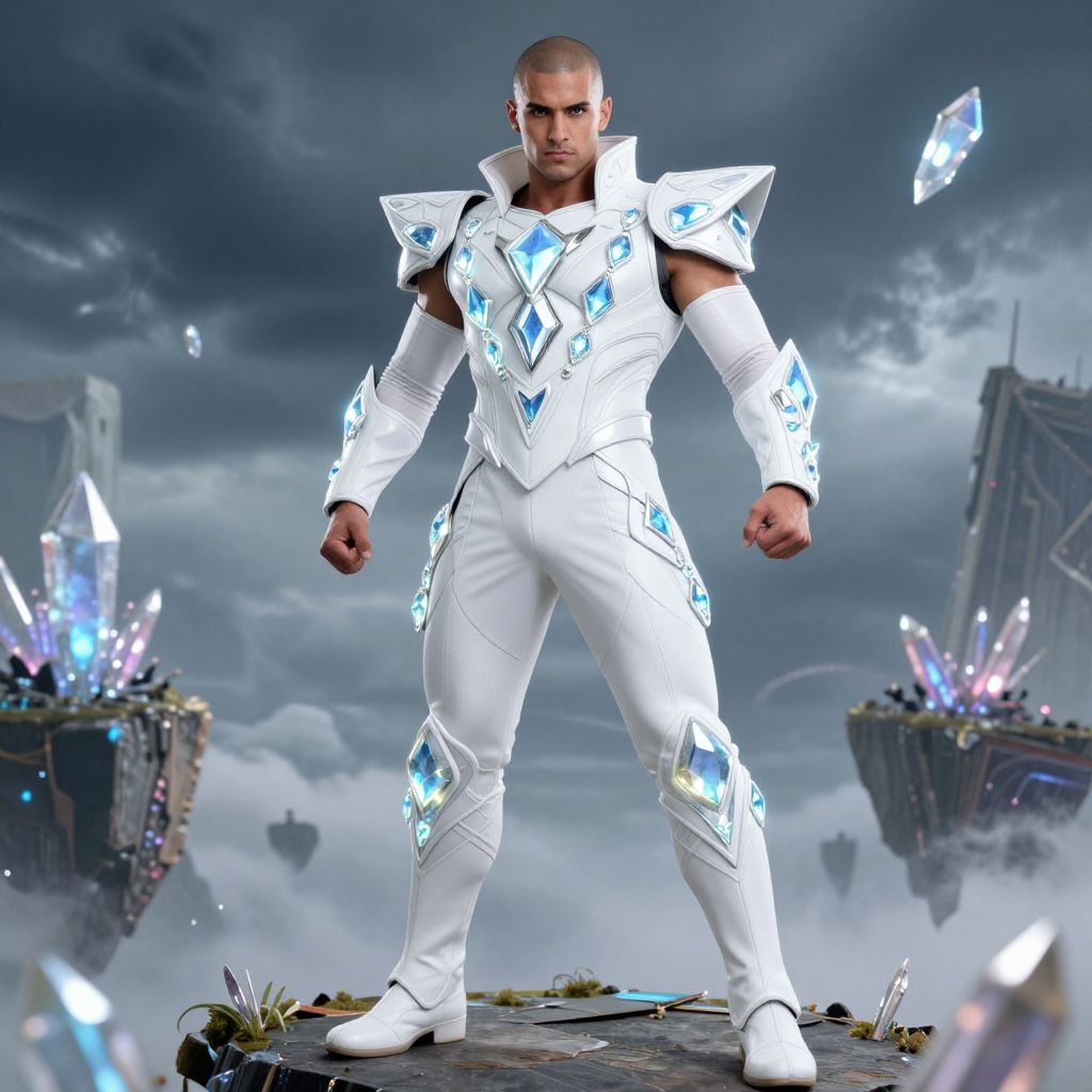 Photorealistic CGI image of a muscular, bald man with a serious expression, standing confidently on a rocky surface. He wears a white, futuristic armor suit adorned with glowing blue and crystal-like accents on the shoulders, chest, and legs. The background features a cloudy, stormy sky with floating, crystal-studded islands. Crystals of various sizes and colors (blue, purple, white) float around him, adding a magical, otherworldly feel. The armor's sleek design contrasts with the rugged, misty environment, highlighting his powerful, heroic presence. The overall style blends fantasy and science fiction elements.