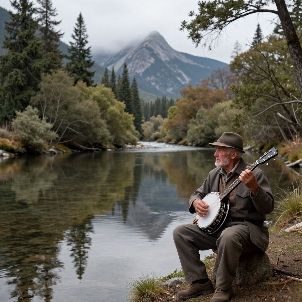 In this serene landscape, an elderly man sits by a tranquil river, engrossed in playing a banjo. His weathered face and rugged attire suggest a life of hard work and experience. The banjo, with its circular body and long neck, rests comfortably in his hands, its strings taut and ready to produce music. The man's hat, a symbol of protection and style, sits atop his head, casting a shadow over his eyes as he gazes into the distance. The river, calm and reflective, flows gently past him, its surface mirroring the surrounding trees and mountains. The trees, a mix of evergreens and deciduous species, frame the scene, their leaves a mix of greens and browns. The mountains in the background rise majestically, their peaks shrouded in mist, adding a sense of depth and grandeur to the landscape. The overall composition is balanced, with the man and his banjo as the focal point, surrounded by the natural beauty of the river and the forest.
