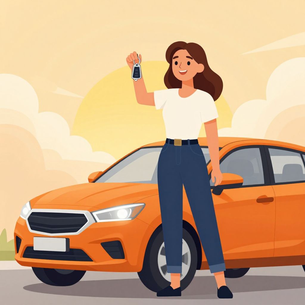Digital illustration of a smiling woman with brown hair, yellow jacket, white shirt, blue pants, and brown shoes, holding a car key beside an orange