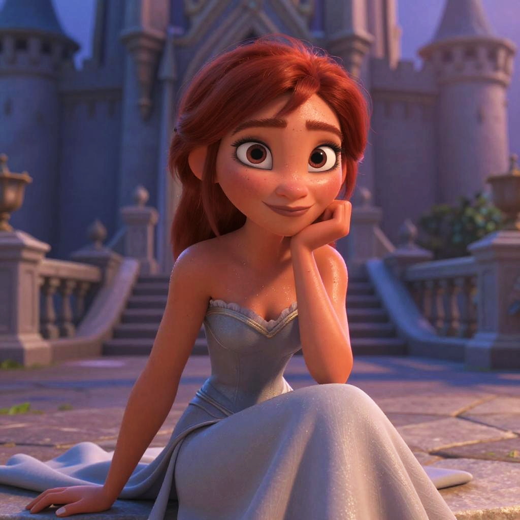 A wise and kind fairy tale character with silver-streaked gray hair and warm brown eyes sits on a velvet chair inside a grand, dusty library, reading a glowing book with golden pages. The room is filled with old shelves, floating book spines, and soft candlelight, with portraits of other fairy tale characters hanging on the walls.