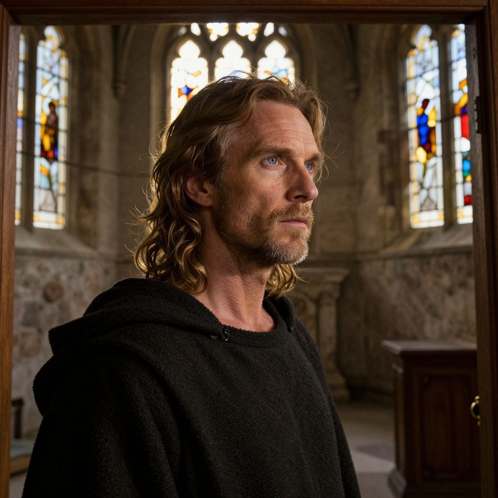 Photograph of a middle-aged white man with long, wavy brown hair and a light beard, standing in a dimly lit stone church with colorful stained glass windows in the background. He has blue eyes, a serious expression, and is wearing a black, textured hoodie. The light from the stained glass windows casts a warm glow on his face. The stone walls and wooden doorframe are visible, adding to the medieval ambiance. The image has a high-contrast, slightly dramatic style, emphasizing the man's facial features and the stained glass.