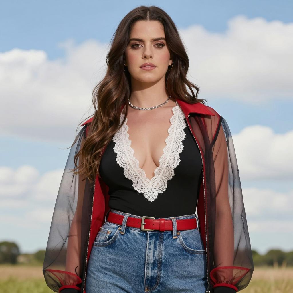 Portrait of a confident full-figured woman with an asymmetrical bob hairstyle, wearing a tailored black blazer and dress pants. She poses in a semi-formal outfit on an industrial rooftop with a city skyline featuring modern and historic skyscrapers in the background under a cloudy sky.