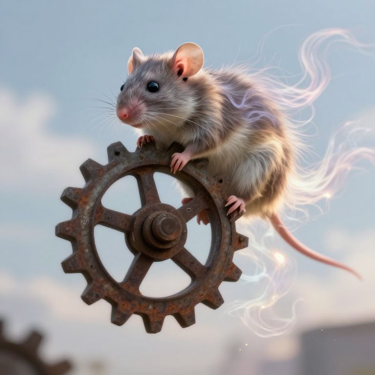 A spectral rodent with flowing, ethereal fur clings to a massive, rusted mechanical gear, its form dissolving into wisps of light as it drifts through a luminous, otherworldly sky.