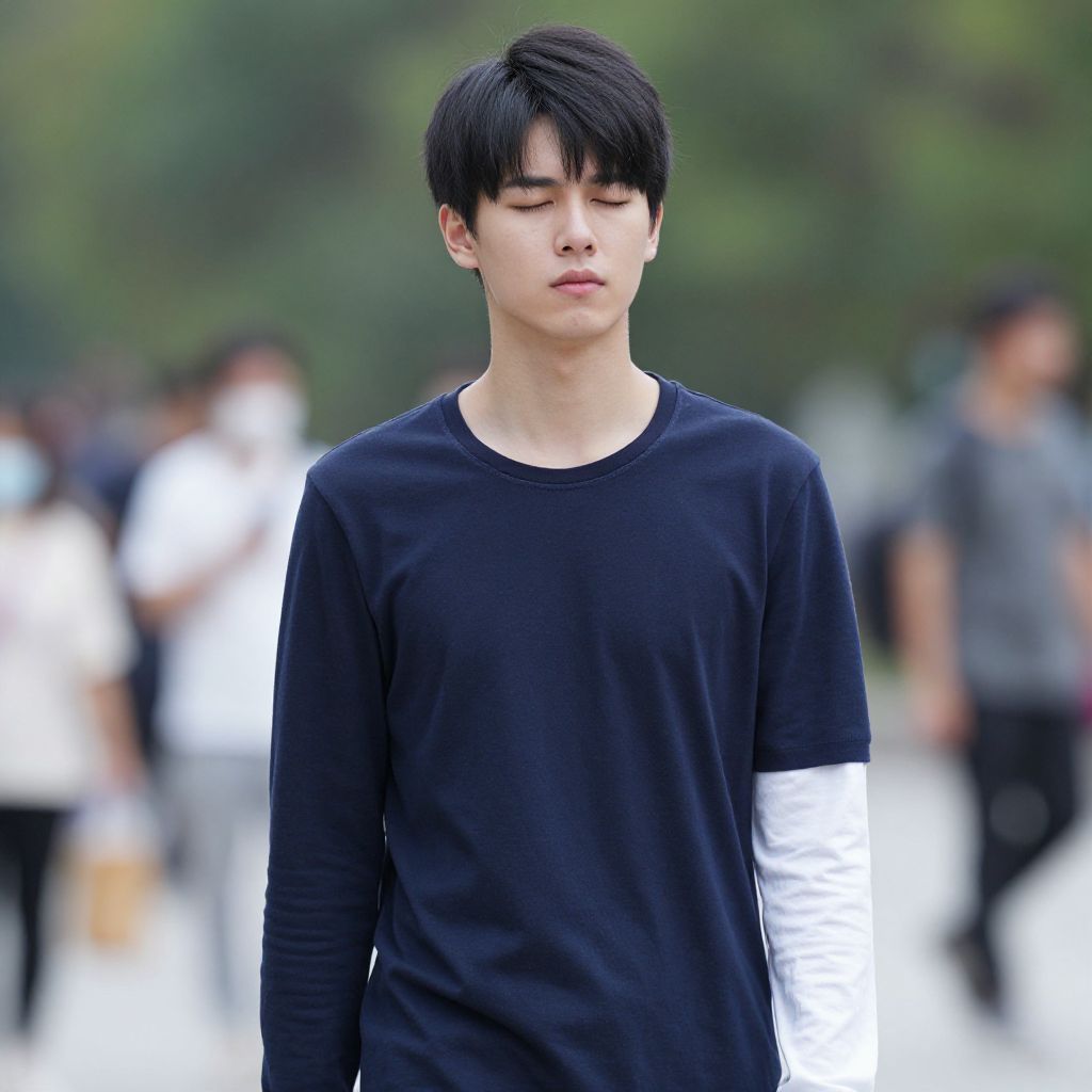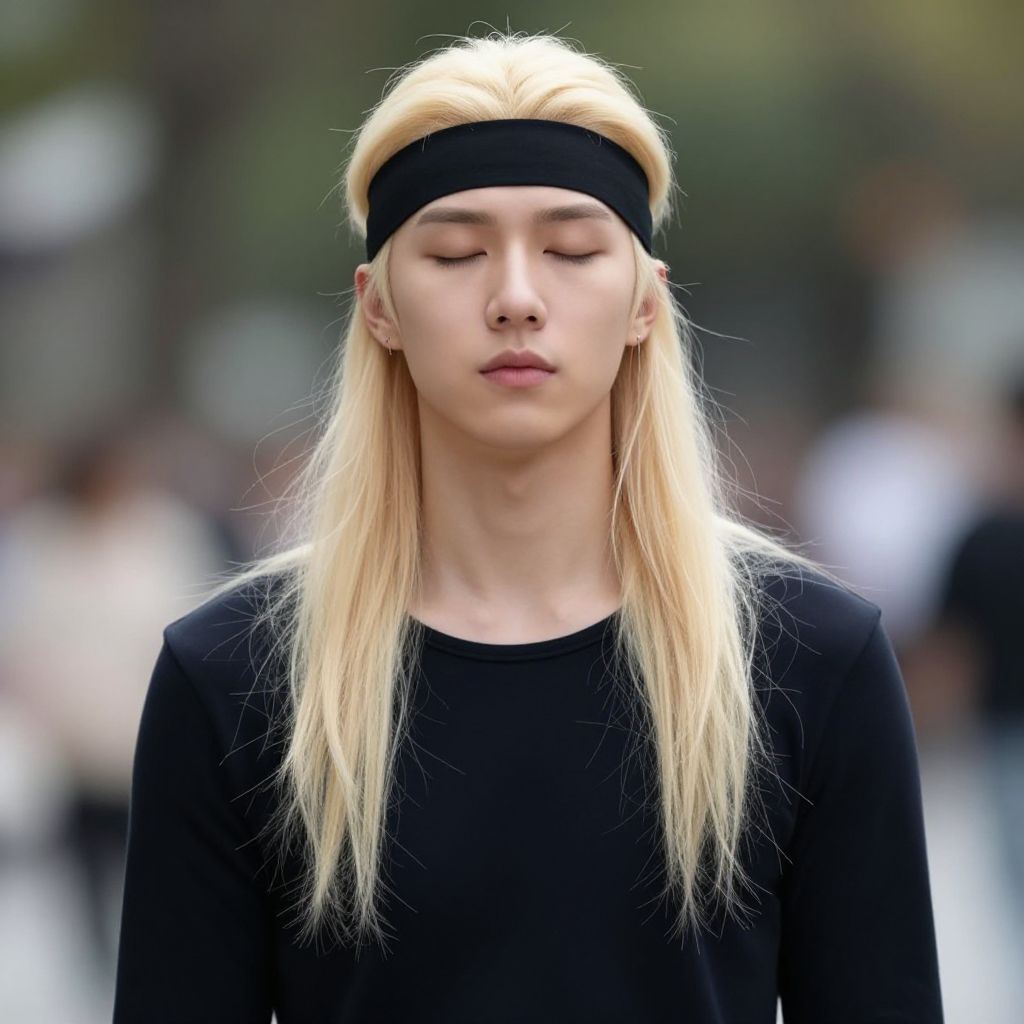 "loba costume, male focus, 1boy, solo, closed eyes, blurry, headband, long hair, realistic, outdoors, blurry background, long sleeves, blonde hair Realistic photo of casual sexy person with pretty face"