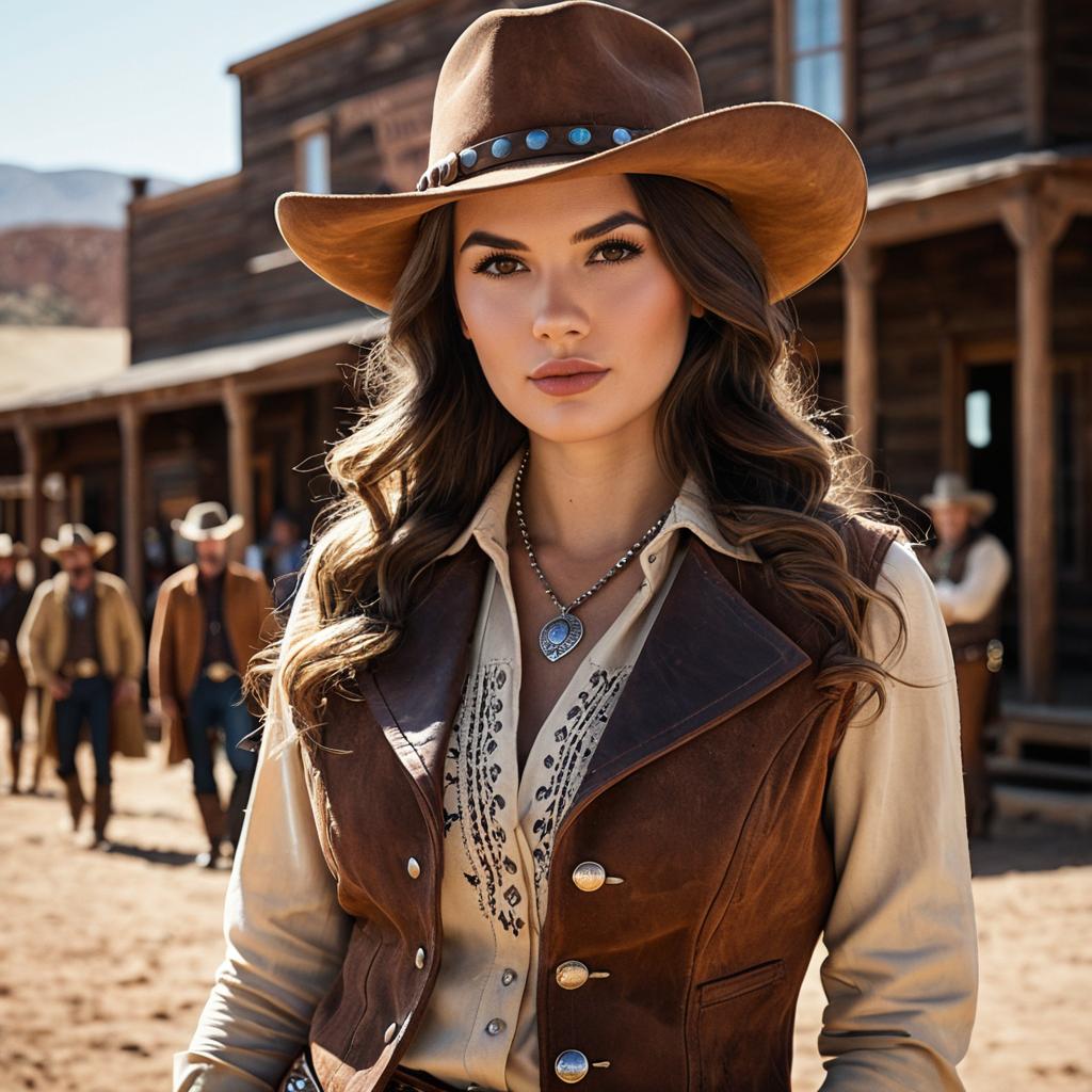 Western outfit, photorealistic, young woman, brown hair, medium-length, wearing a brown cowboy hat, serious expression, brown eyes, light skin, brown and beige outfit, sleeveless dark blue vest, brown leather straps, beige long-sleeve shirt, high-waisted brown pants, detailed belt with circular buckle and chain, standing in front of Western-style buildings, mountains in background, late afternoon sunlight, realistic ures, digital art, movie still, Western genre, character design, close-up, centered composition
