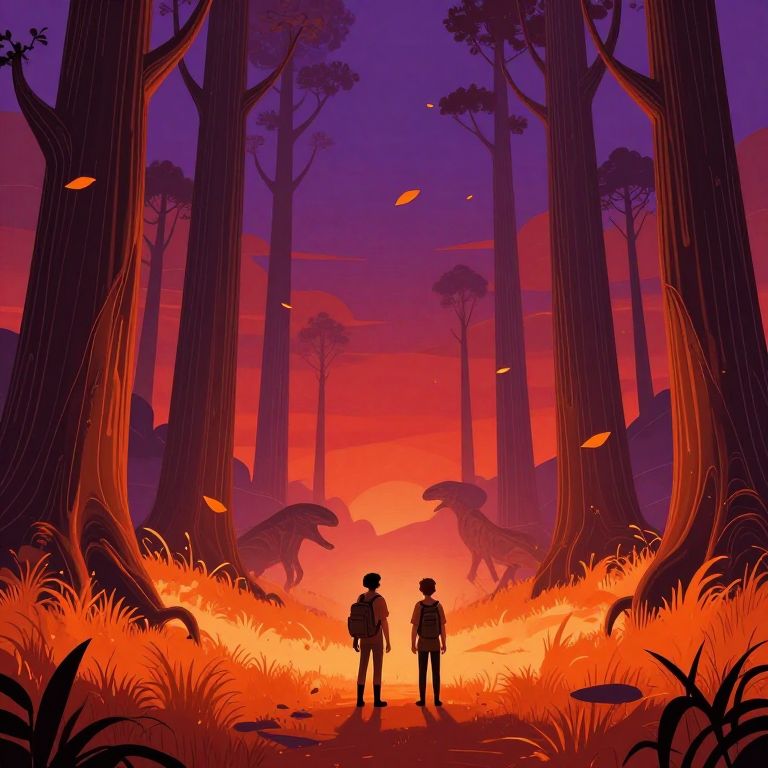 In this captivating 2D art piece, two figures, one with a backpack, stand on a path leading towards a mysterious, glowing orange grassy area. The sky is a stunning blend of purple and red hues, with orange leaves floating gently in the air. The scene is dominated by towering, hundreds of feet tall trees with intricate, solid lines and a Ligne Claire style, creating a sense of depth and scale. In the distance, two large, alien-like animals lumber around, adding to the otherworldly atmosphere. The overall composition is balanced, with the figures positioned centrally, drawing the viewer's eye towards the glowing grass and the towering trees, creating a sense of anticipation and wonder. The interplay of colors, textures, and shapes creates a visually rich and immersive experience, evoking a sense of adventure and exploration in this 70's sci-fi rotoscope style.