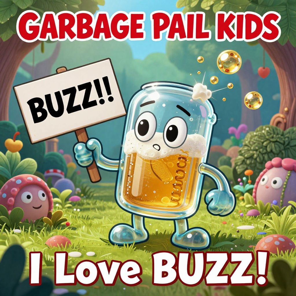 A vibrant cartoon-style image of a Garbage Pail Kid named \"BUZZ\" with the iconic \"GARBAGE PAIL KIDS\" logo in bold red lettering at the top, \"I Love BUZZ!\" is written in bold letters at the bottom of the image, A liquid glass creature holding a sign \"BUZZ!!!\", He stands in a garden with sunlight glinting off his glassy surface, The creature is half filled with beer, burping golden bubbles into the air, The scene is filled with vibrant, otherworldly colors and exaggerated, cartoonish details