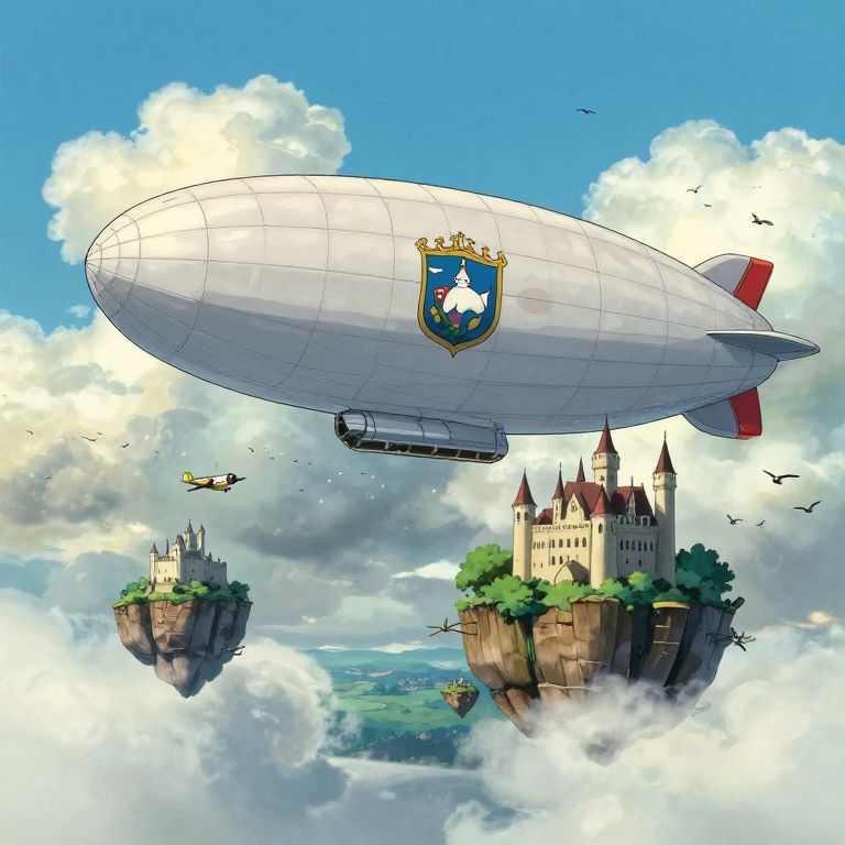 A huge airship flies past the flying islands, the action takes place high on the ground among the clouds, Hayao Miyazaki's style, a royal airship, the kingdom's coat of arms is on the airship, there is a castle on the flying island, sunny weather, beautiful clouds, small propeller planes and flocks of birds fly past the airship