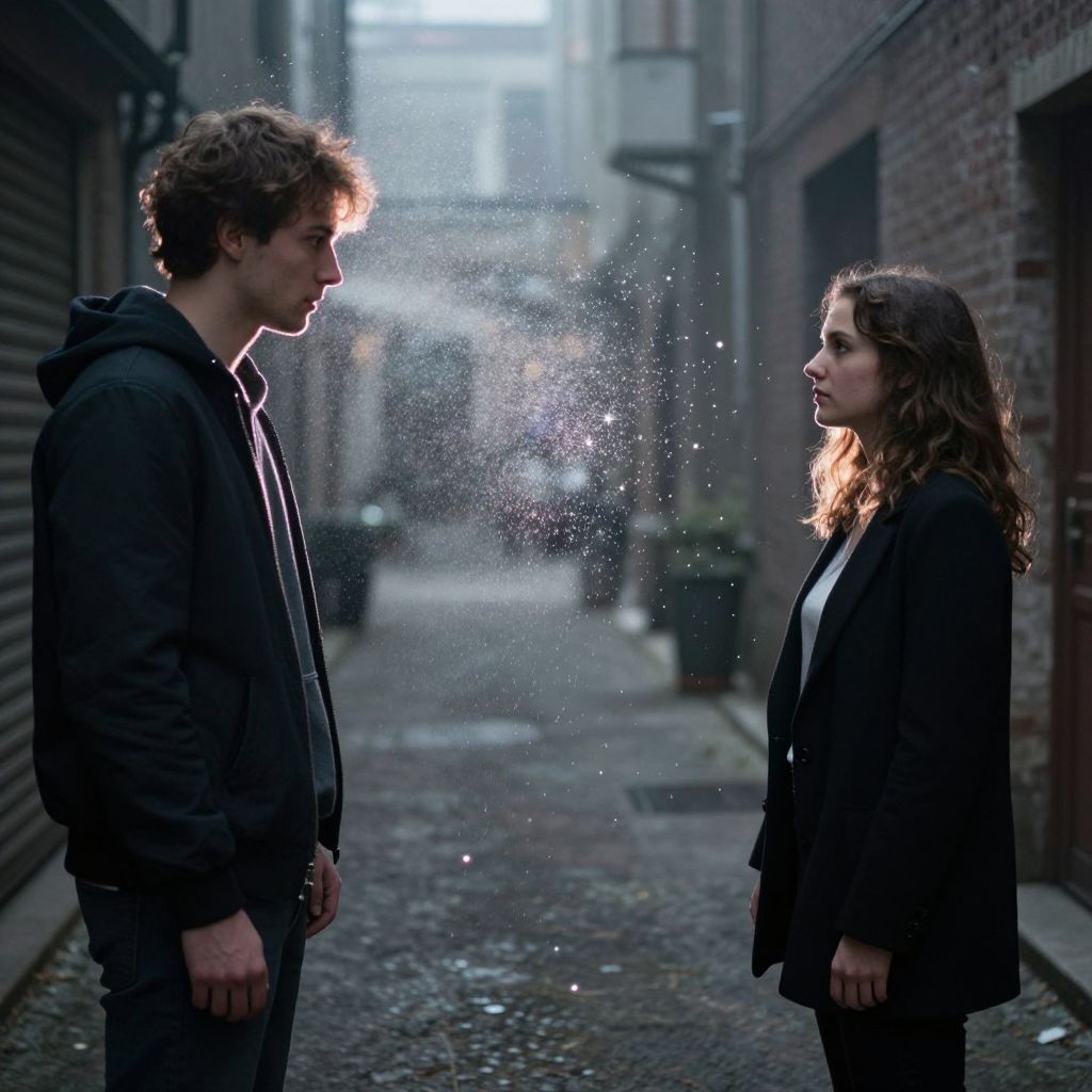 In a misty urban alley, a man conjures a cascade of sparkling particles, blurring the line between reality and illusion, while a woman stands transfixed, her gaze a mirror of wonder and introspection.
