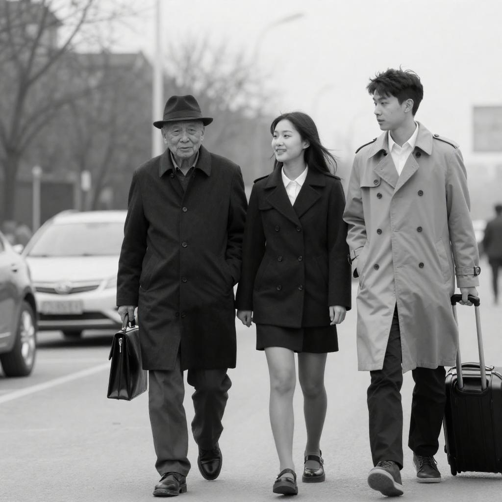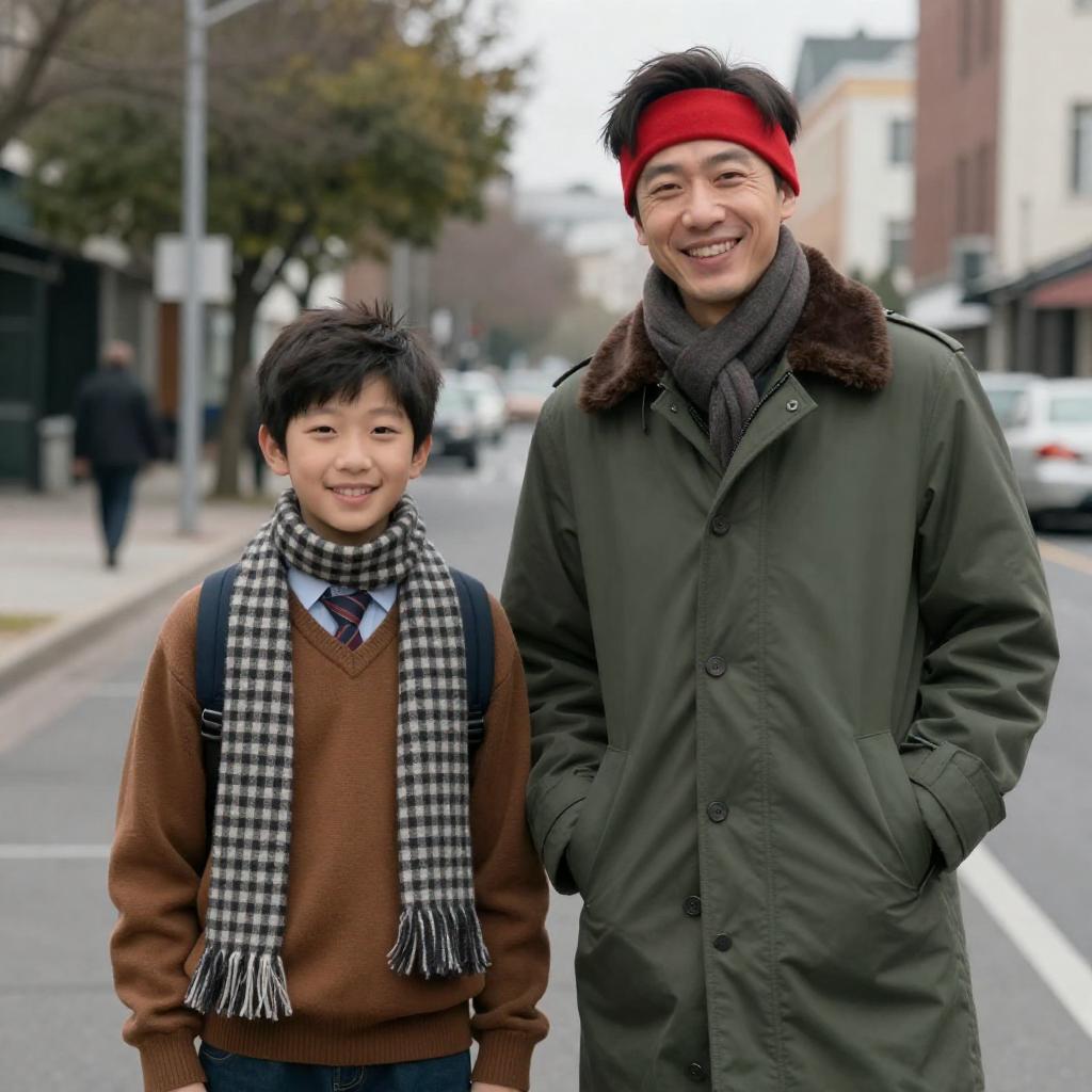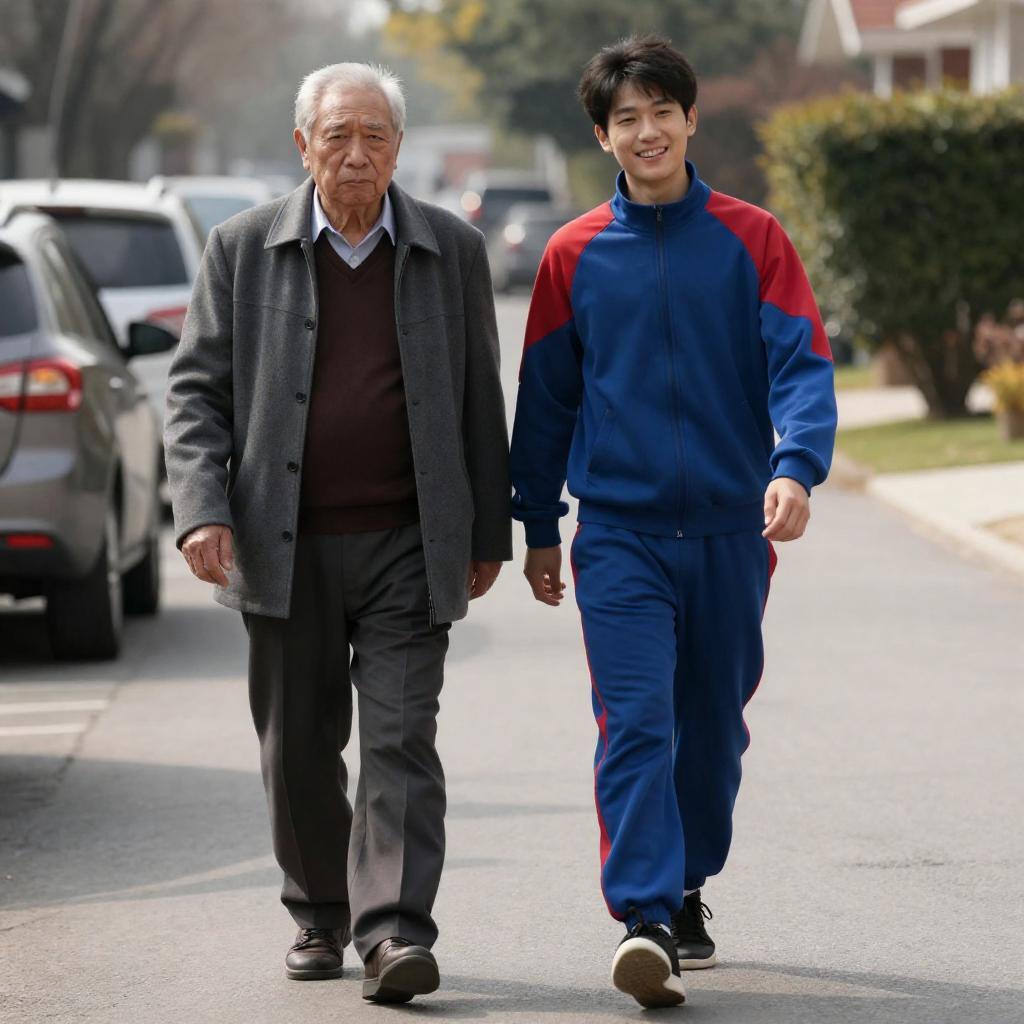 Two men walking down a suburban street. Elderly man in gray coat and brown sweater, serious expression. Younger man in blue and red tracksuit, black sneakers, smiling, mid-stride, right leg lifted. Parked cars on left, bushes on right. Bright daylight.