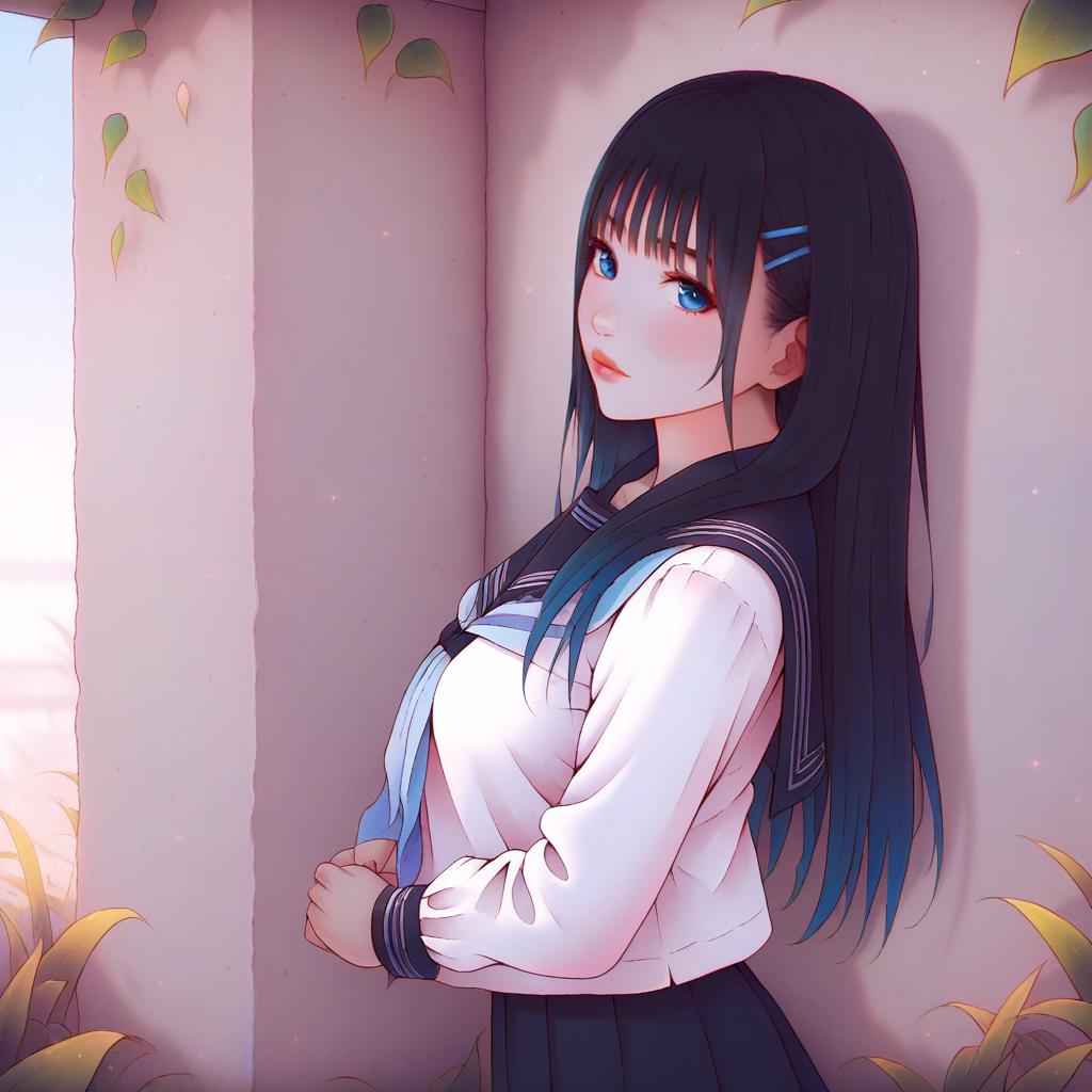 Akebi komichi, akebi-chan no serafuku, 1girl, blue eyes, long hair, black hair, serafuku, serafuku, roubai academy school uniform (old), pleated skirt, white shirt, long sleeves, black sailor collar, by artist soranamae, animagine