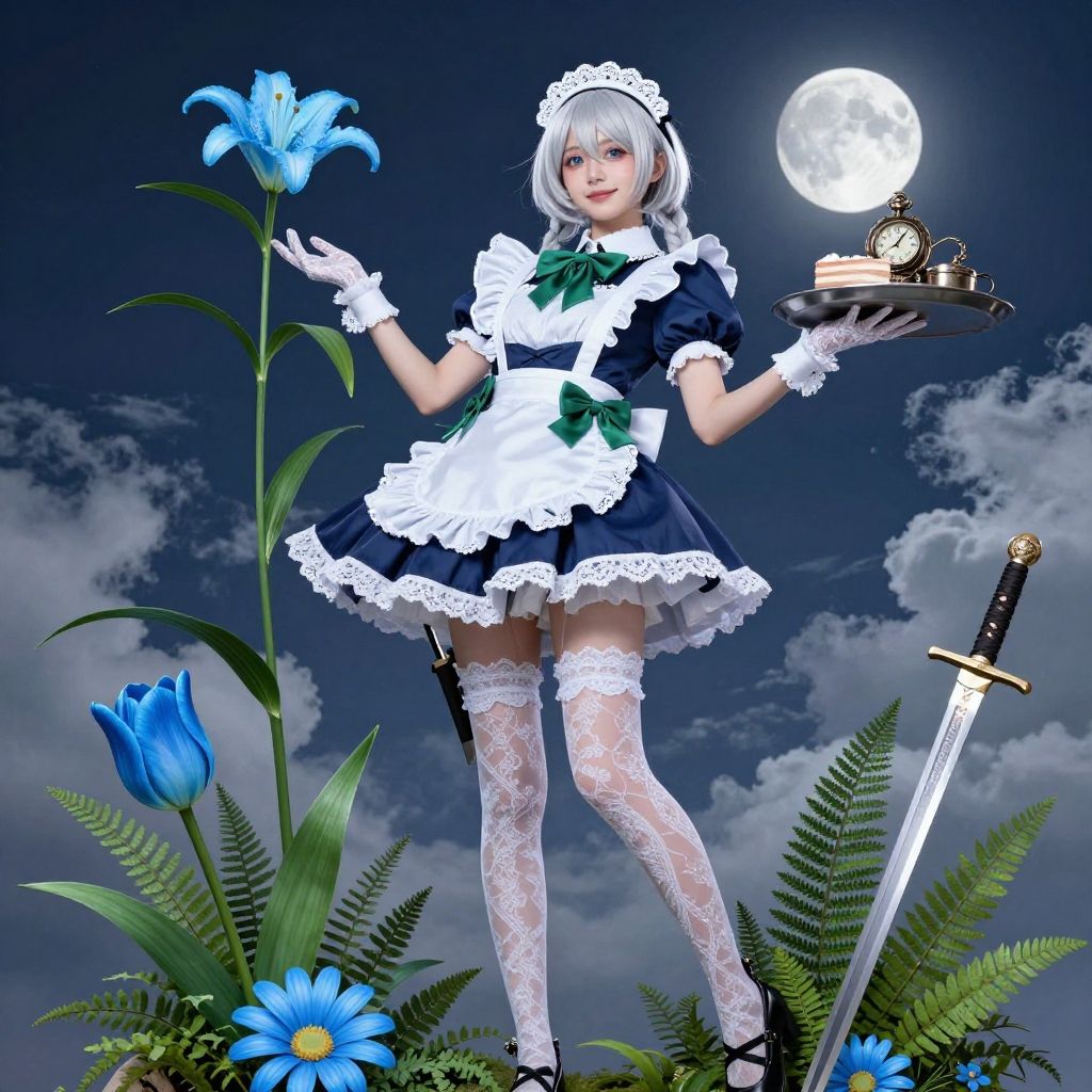 Highres, realistic, (intricate delicate details), 1girl, solo, flower, blue lily, lily, green lily leaves, blue daisy, daisy, blue daisy leaves, blue tulip, tulip, green tulip leaves, green fern, fern, night, Moon, clouds, izayoi sakuya, low angle, from below, girly, smile, white hair, silver hair, short hair, long neck, blue eyes, tall, skinny, slender, sporty, slither, long legs, narrow hips, flat chest, dynamic pose, intricate lace, lace, (white intricate lacy gloves:1.2), (white gloves:1.2), white intricate lacy wrist cuffs, white writs cuffs, white intricate lacy apron, white apron, white intricate lacy thighhighs, white thighhighs, knife holster, knife sheath, (black cross-laced footwear:1.2), maid, blue maid uniform, dark maid uniform, (long skirt:1.2), blue skirt, dark skirt, twin braids, (green bows:1.2), green lacy bowtie, green bowtie, white lacy maid headdress, maid headdress, clock, (pocket watch:1.4), sword, knife, knives, dagger, (tray:0.95), (cooffee set:0.95), (tea set:0.95), (cake:0.95), looking at viewer
