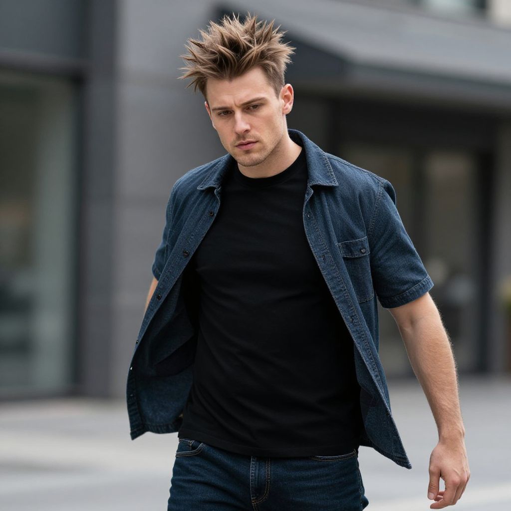 Layered looks for men, european man, man with a lean build and expressive eyes, wearing a layered look of a black t-shirt, a flannel shirt, and a denim jacket, standing in a modern street with a casual and trendy appearance, realistic photography style